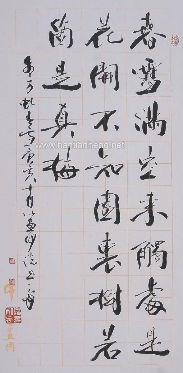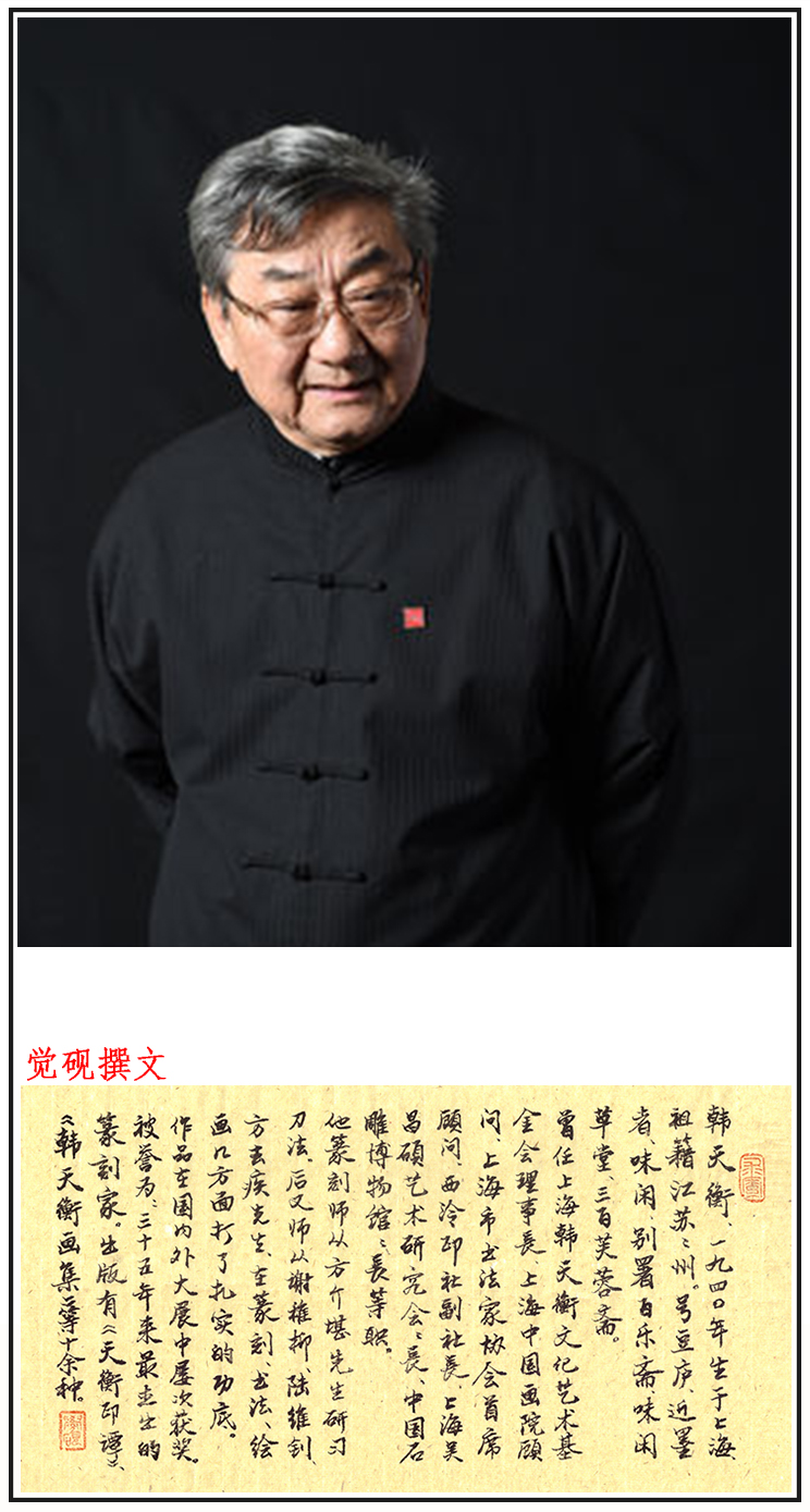 韩天衡 [1] ,1940年生于上海,祖籍江苏苏州。号豆庐、近墨者、味闲,别署百乐斋、味闲草堂、三百芙蓉斋。擅书法、国画、篆刻、美术理论及书画印鉴赏。现任上海韩天衡文化艺术基金会理事长、中国艺术研究院中国篆刻艺术院名誉院长、韩天衡艺术教育基地校长、上海中国画院顾问(原副院长)、国家一级美术师、享受国务院特殊津贴专家、上海市书法家协会首席顾问、西泠印社副社长、上海吴昌硕艺术研究会会长、吴昌硕纪念馆馆长、中国石雕博物馆馆长、中国社会科学院研究生院教授、上海交通大学教授、华东政法大学教授、温州大学教授、华东师范大学艺术研究所特聘教授、复旦大学哲学学院特聘教授。
