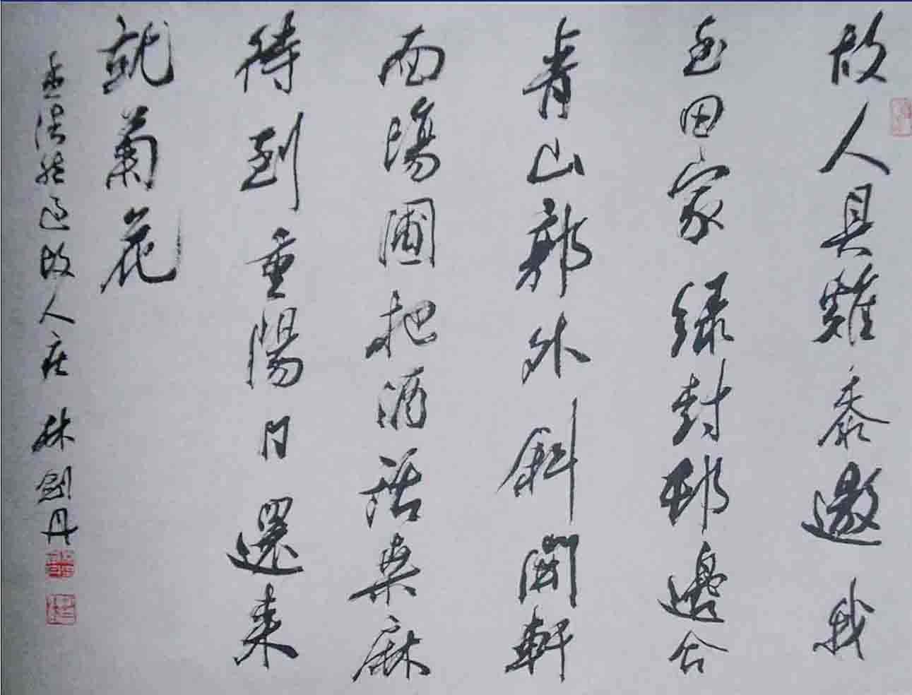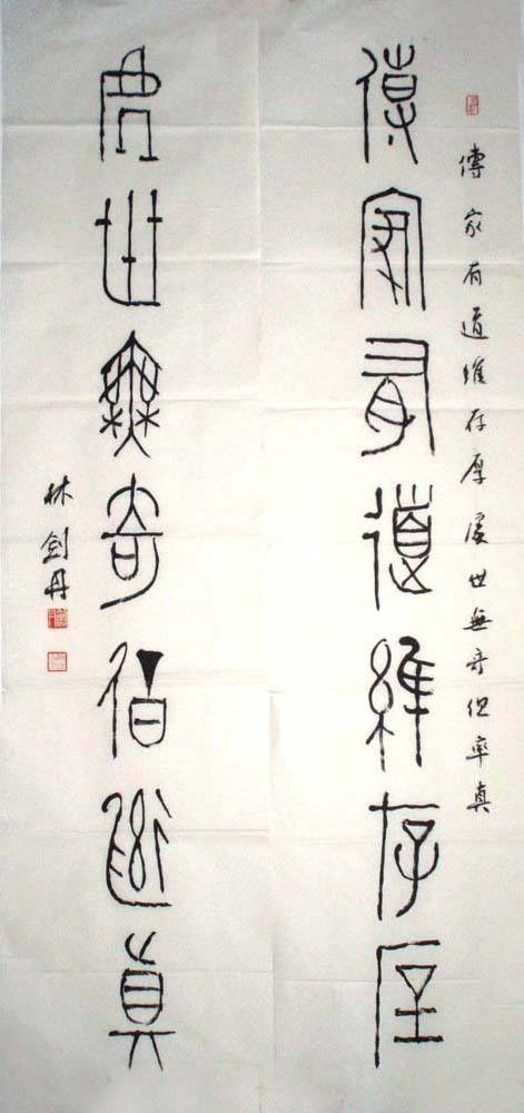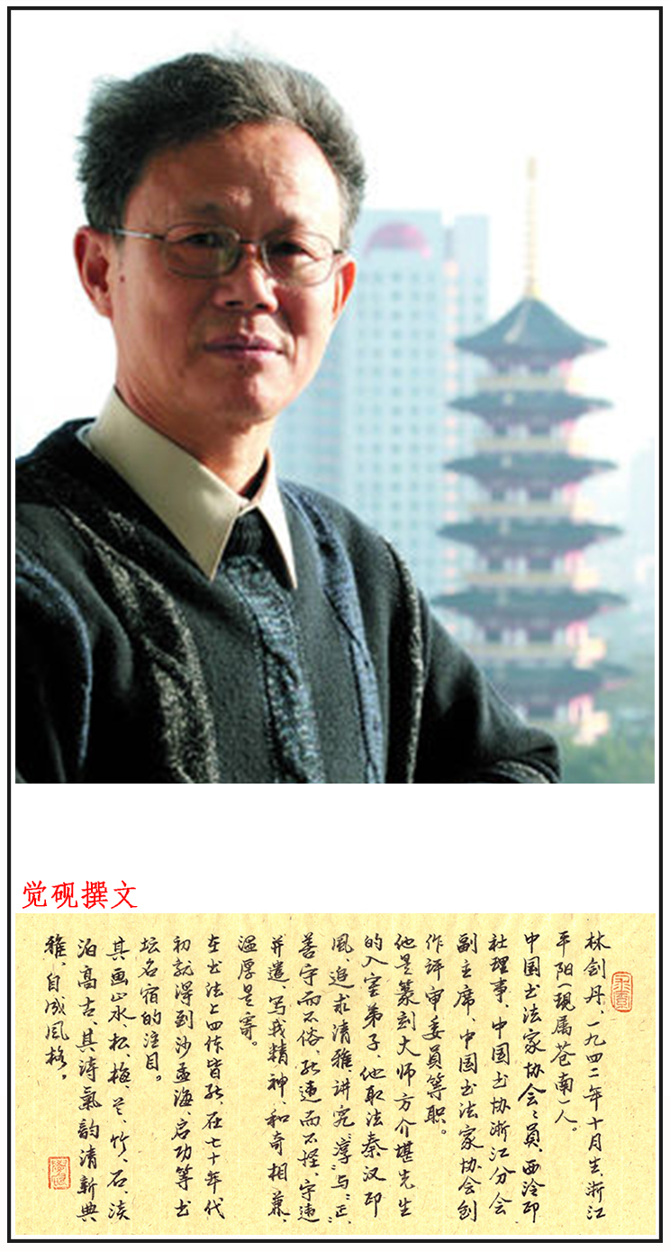 林剑丹(1942.10--),浙江平阳(现属苍南)人 。2012获第四届中国书法最高奖兰亭奖,现为温州市书画院名誉院长、中国篆刻研究院研究员、中国美术学院客座教授、浙江省文史研究馆馆员国家一级美术师、西泠印社理事。中华诗词学会会员,中国书法家协会会员,书协浙江分会副主席,温州市书协主席 。现为中国书法家协会创作评审委员,浙江省书法家协会副主席,西泠印社社员,温州书画院院长,国家一级美术师,连续三次被评为温州市专业技术拔尖人才,享受国务院颁发的政府特殊津贴。其书法作品入选历届"全国书展"、"全国中青展",并在专业刊物上专题介绍多次。参加国内外大型书法活动,向各地名胜古迹和纪念博物馆提供书画作品。1987年以中国著名书法家代表身份参加中日两国书法交流史上级别最高的"中日书法讨论会"和"中日兰亭书会"。篆刻得到已故金石大师方介堪先生亲炙,上宗秦汉下及明清诸家;书法善五体书,风格多变,秀丽中带苍劲;其画山水或松梅兰竹石,淡泊高古;其诗气韵清新典雅。
