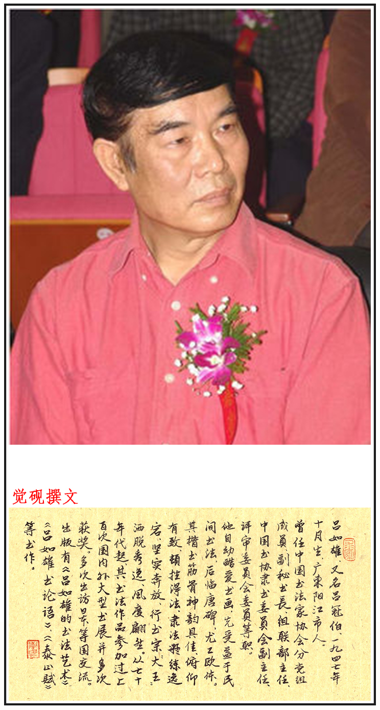 吕如雄,1947年出生于广东省阳江市,曾为中国书法家协会分党组成员,副秘书长,评审委员会委员,篆刻委员会和刻字委员会副主任、副编审、组联部主任,中国书法家协会书法培训中心教授。