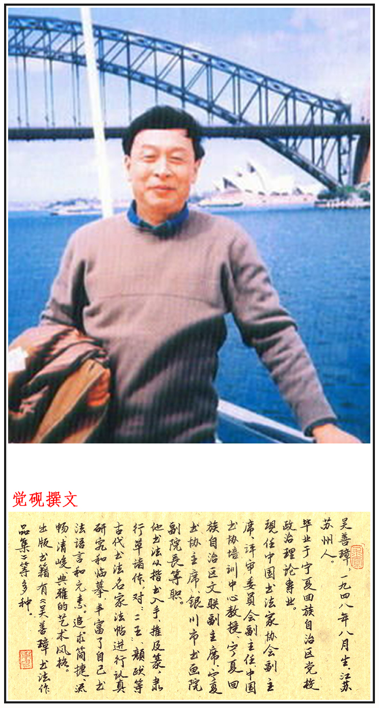 吴善璋,男,汉族,1948年8月生,江苏苏州人。1985年6月入党,1968年1月参加工作,毕业于宁夏回族自治区党校政治理论专业,大专学历。现任中国书法家协会副主席、评审委员会副主任,中国书协培训中心教授,宁夏回族自治区文联副主席,宁夏书协主席,银川市书画院副院长、一级美术师。