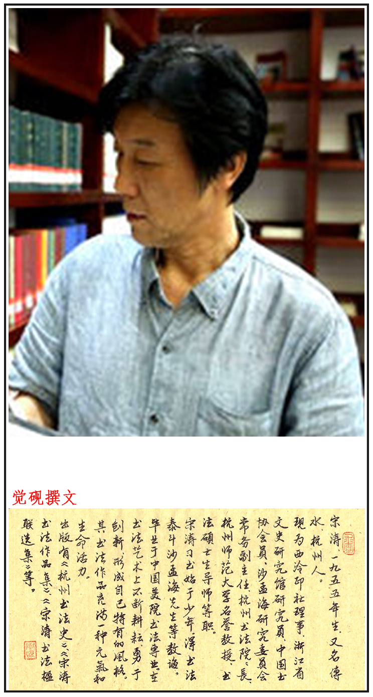 宋涛,又名传水,1955年生,杭州人,曾任杭州市政协文史委员会主任,长期从事杭州地方史研究和书法创作。现为西泠印社理事,浙江省文史研究馆研究员,中国书法家协会会员,浙江省书法家协会主席团成员,沙孟海研究委员会常务副主任,杭州书法院院长,杭州市书法家协会常务副主席,杭州师范大学名誉教授,书法硕士生导师。