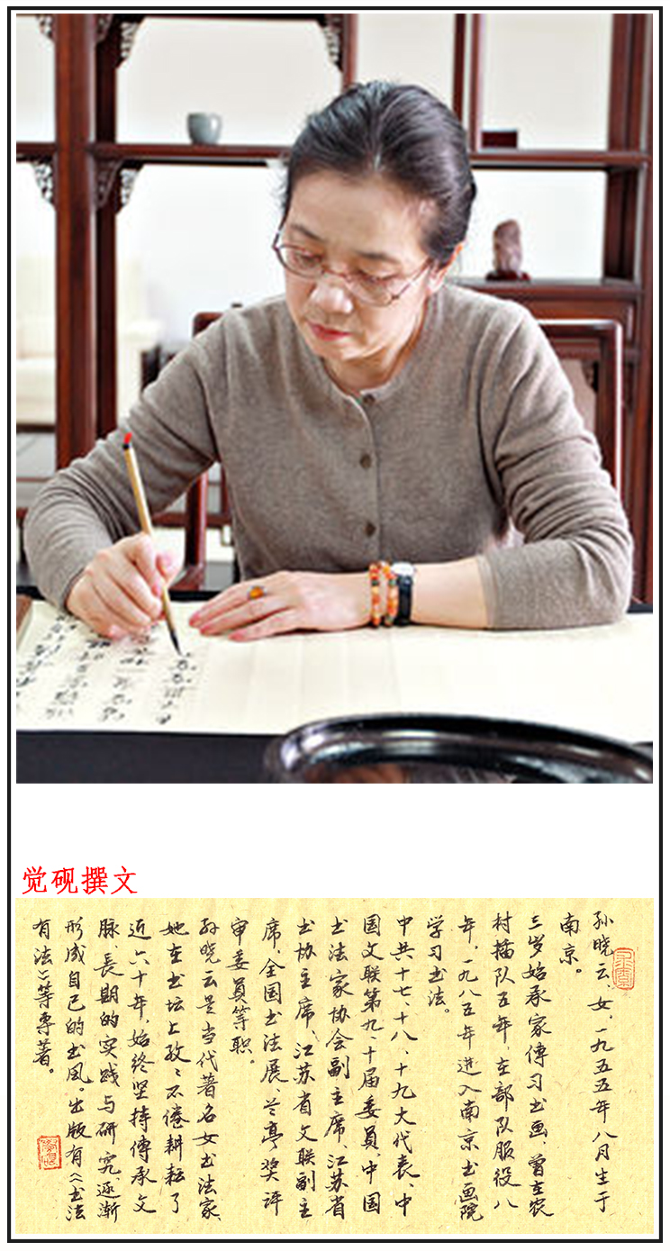 孙晓云,女。一九五五年八月生于南京,三岁始承家传习书画,曾在农村插队五年,在部队服役八年。中共十七、十八、十九大代表 [1] ,中国文联第九、十届委员,中国书法家协会副主席,江苏省书法家协会主席,江苏省政府参事,江苏省文联副主席,江苏省美术馆名誉馆长。全国书法展、兰亭奖评审委员,中国国家画院书法篆刻院副院长,享受国务院特殊津贴。一级美术师。中央美术学院博导、硕导,苏州大学博导。