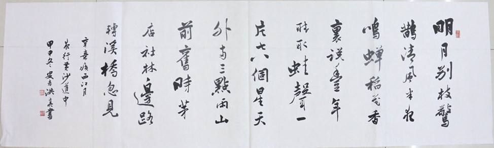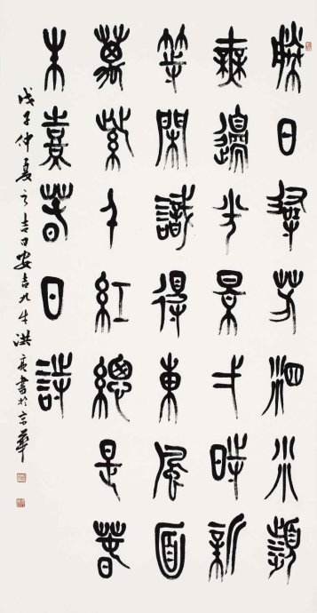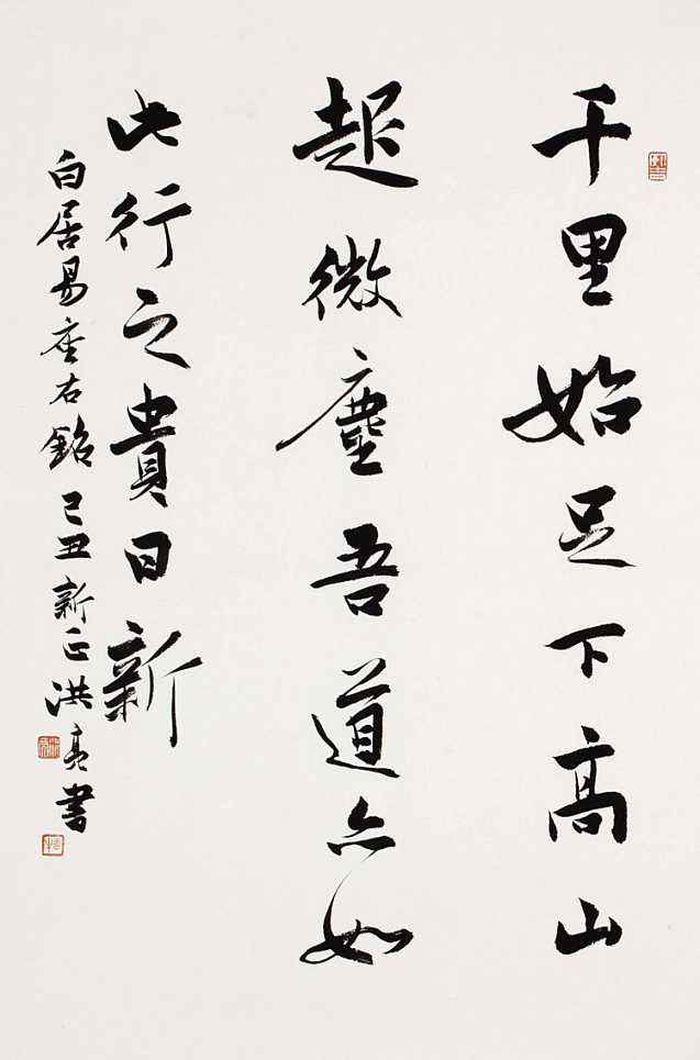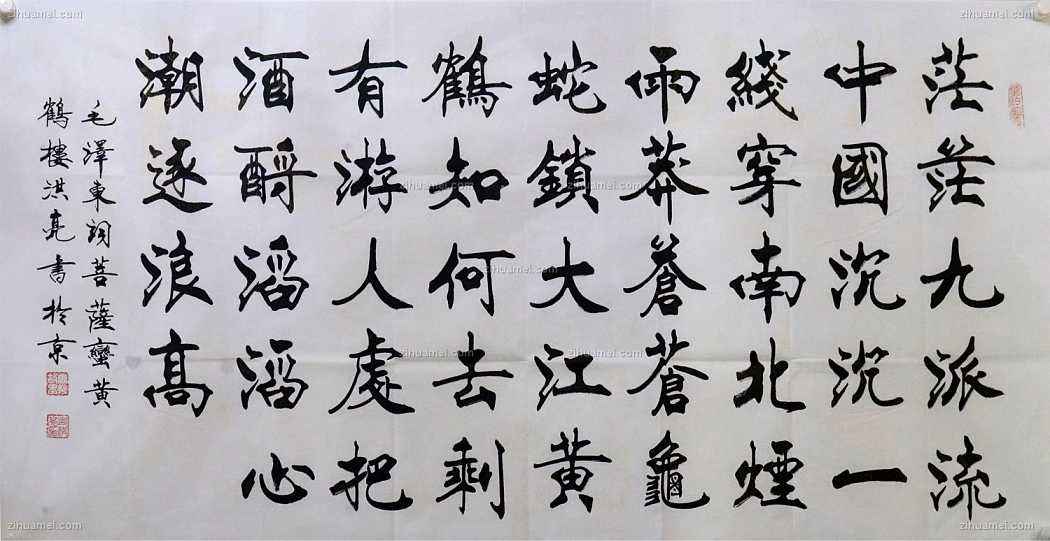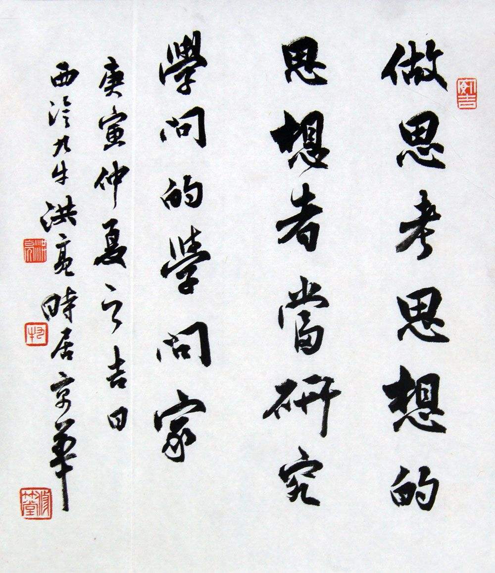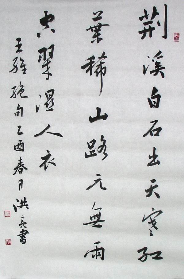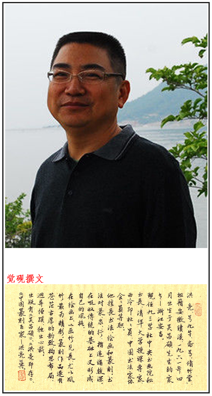 洪亮,号九牛,斋号“修竹堂”,祖籍安徽绩溪,1961年4月生于吴昌硕先生的家乡---浙江安吉,在其令尊的影响下自幼爱好书画篆刻,受邻居姜大公先生的启蒙,逐入门径。上个世纪的70年代末80年代初,时常奔波安吉、杭州两地之间,曾先后受教于诸乐三、余任天、周昌谷、潘韵、刘江等诸先生。2005年迁居北京,从著名学者、北大教授金开诚先生。在书法、国画、篆刻、诗词方面有深厚的基础和文化底蕴。2005-2006年北京大学访问学者,2007-2011年《中国书法》执行编辑,。2005年开始在国内外大学讲授中国文化与中国书画篆刻艺术,编著《大学书法教材》。在专业报刊上发表论文、评论计150多万字。作品多次参加全国展、中青展、西泠印社评展等并获奖。应邀在北京大学、清华大学、中央电视台作书法讲座,应邀赴美国、韩国讲学,作书画创作交流。作品被国内外多家博物馆收藏,被风景名胜区勒石刻碑。 [1]