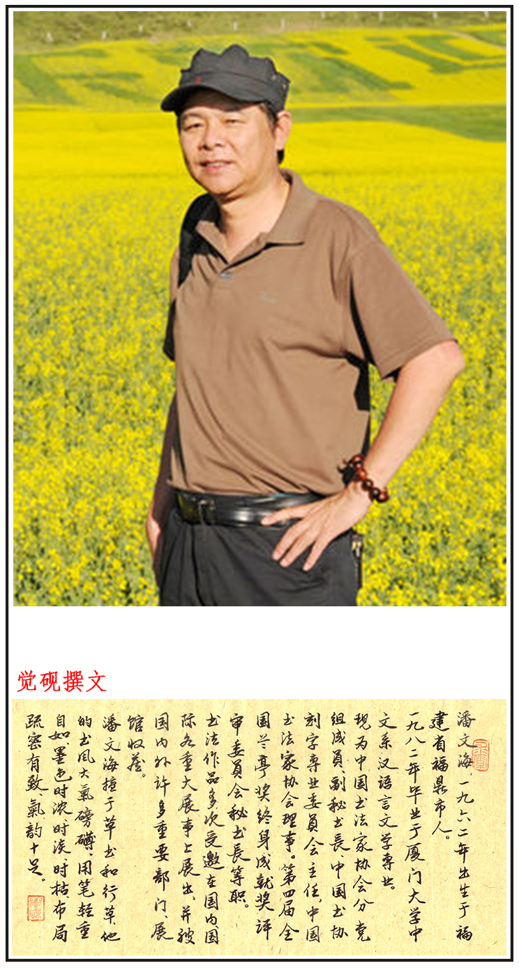 潘文海,男,1962年出生,福建省福鼎市人。1982年毕业于厦门大学中文系汉语言文学专业。曾就职于化学工业部机关党委、中国化工报社、中国化工文联、中国文联国内联络部。现为中国书法家协会分党组成员、副秘书长 [1] ,中国书协刻字专业委员会主任,中国书协理事。 [2]