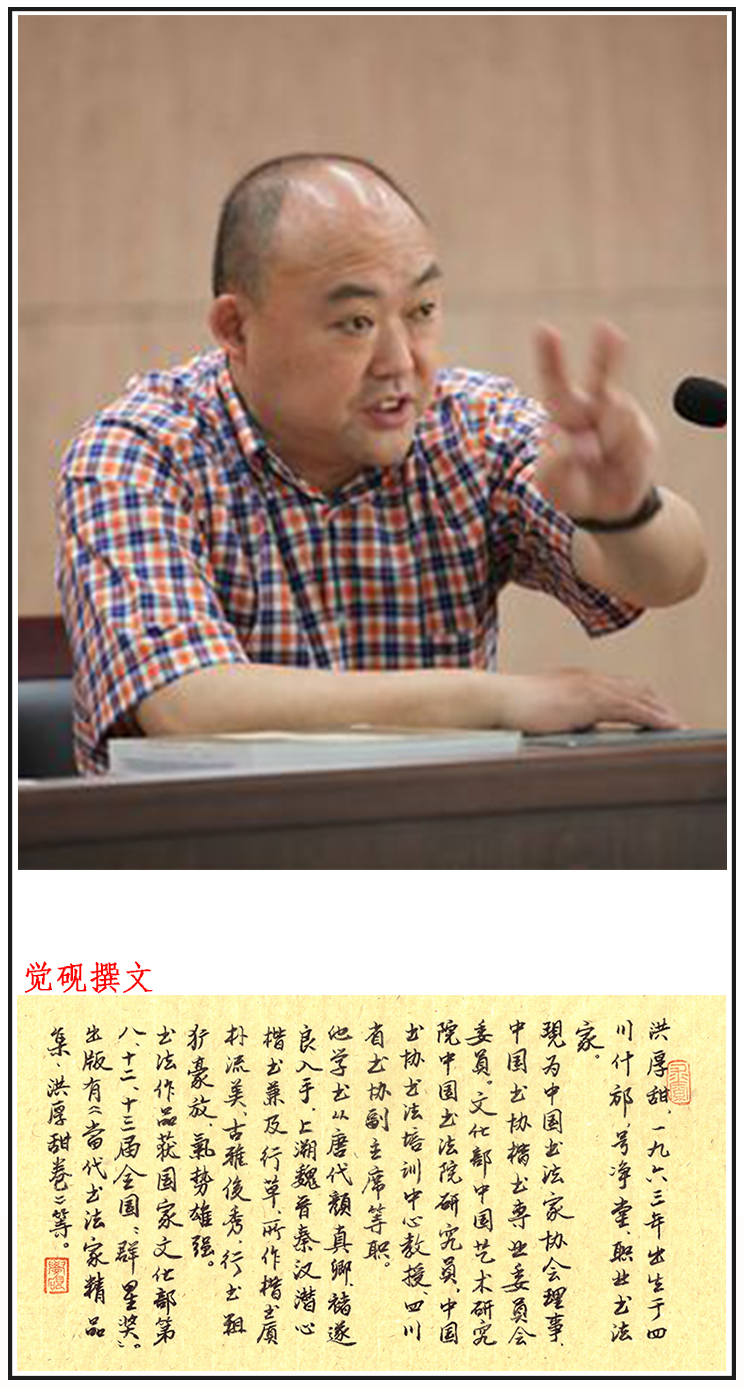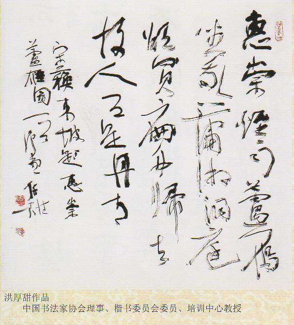 洪厚甜,1963年出生于四川什邡,号净堂。职业书法家。现为中国书法家协会理事,中国书法家协会楷书专业委员会委员,文化部中国艺术研究院中国书法院研究员,中国书法家协会书法培训中心教授、专家工作室导师,中国民主同盟中央美术院理事,中央数字电视书画频道特聘教授,中国教育学会书法教育专业委员会常务理事,清华大学导师工作室导师,华东师范大学书法教育与心理研究中心研究员,西安培华学院教授。四川省书法家协会副主席、正体书专业委员会主任,四川省政协书画研究院专职副院长兼秘书长。