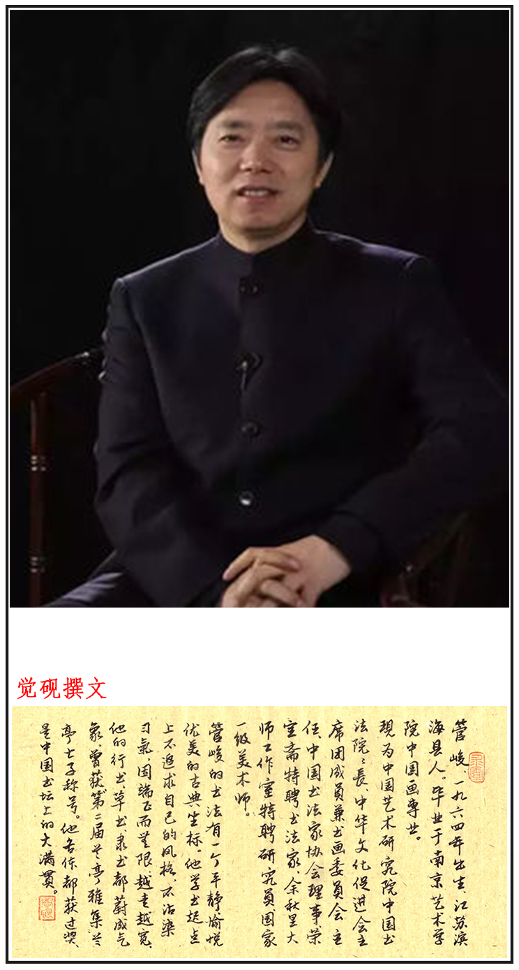 管峻,1964年出生,江苏滨海县人。毕业于南京艺术学院中国画专业。作品被编入《中国现代美术全集·书法卷》、《当代书法名家作品集》。先后被评为全国十大青年书法家第一名、全国书法十大年度人物,中华文化十大年度人物等。其书法作品先后荣获中国书协举办的各项书法活动全国奖、创作奖、最高奖等奖项。
