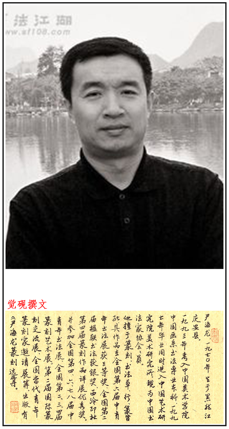 尹海龙,1970年生于黑龙江庆安县。尹海龙是目前收藏市场著名的的篆刻家之一。代表作有《尹海龙篆刻选》、《古玺技法解析》。1993年考入中国美术学院中国画系书法专业本科。1997年毕业同时进入中国艺术研究院美术研究所。中国书协会员。