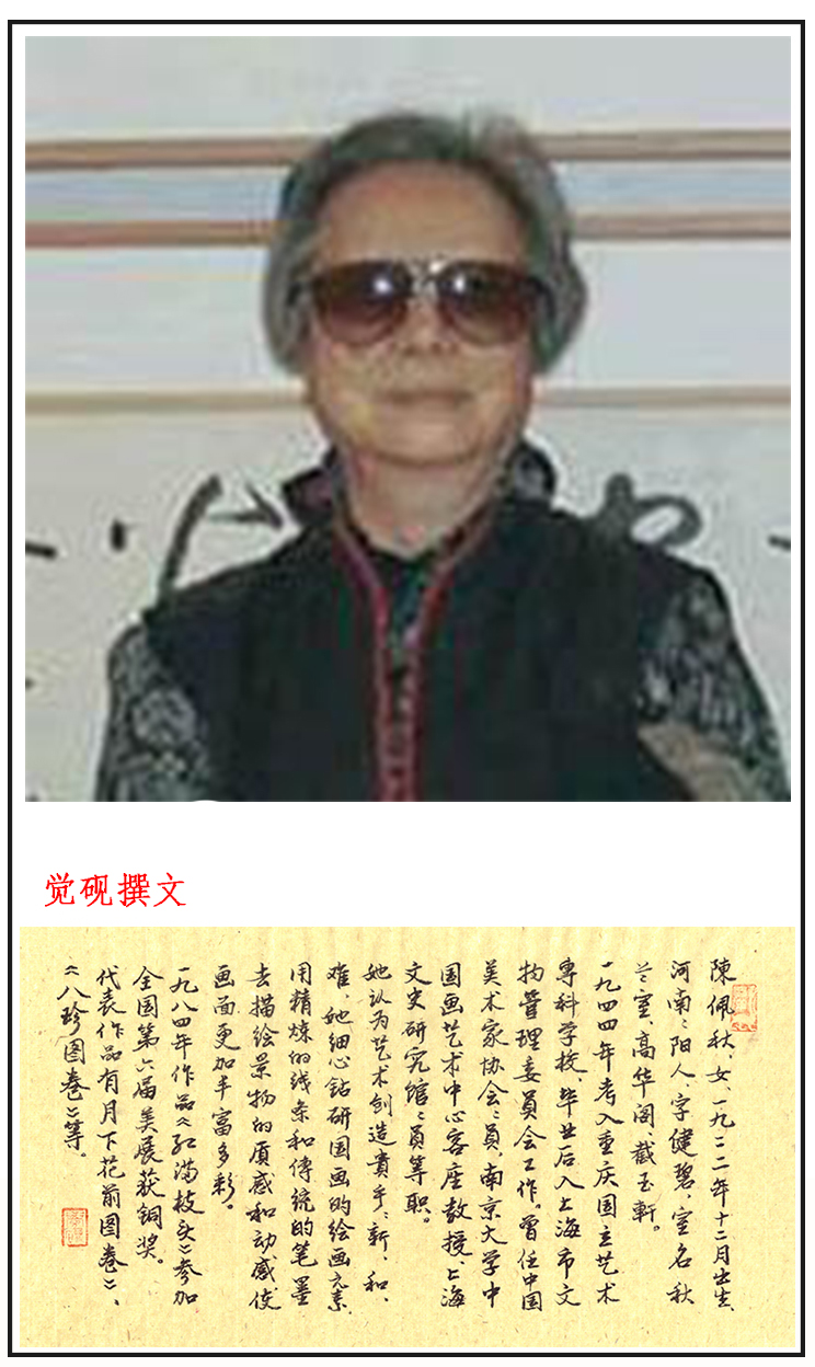 陈佩秋1922年12月生,女,河南南阳人。字健碧,室名秋兰室、高华阁、截玉轩。 国立艺术专科学校毕业 。上海大学美术学院兼职教授,上海中国画院画师 。中国美术家协会会员 。擅长中国画 。作品有《天目山杜鹃》;《水佩风裳》入选第三届全国美展;《红满枝头》入选第六届全国美展优秀作品展 。