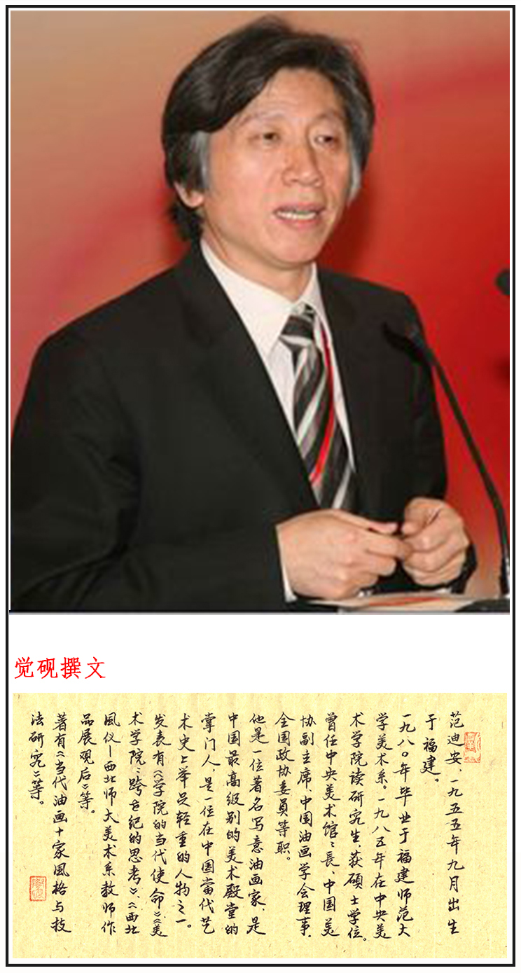 范迪安,1955年生于福建,曾任中央美院副院长,教授,现任中国美术馆馆长,中国美协副主席,全国美术馆专业委员会主任,中国油画学会理事,全国政协委员。从事20世纪中国美术研究、当代艺术批评与展览策划、艺术博物馆学研究。曾担任威尼斯双年展中国国家馆、中法文化年、中意文化年、上海双年展等展览项目的策展工作。现任十三届全国政协文化文史和学习委员会委员,中央美术学院院长。