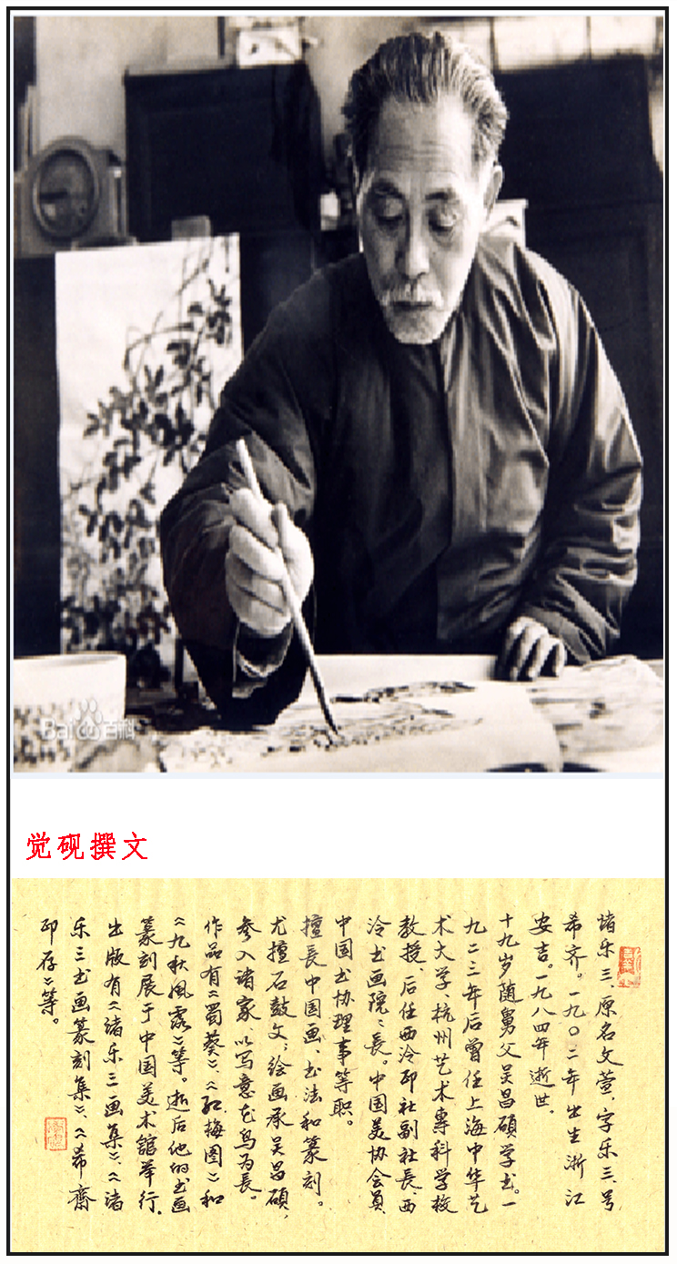 诸乐三 (1902.2.14-1984.1.29),原名文萱、字乐三、号希斋,别署南屿山人。浙江安吉鹤溪村人。著名国画家、杰出的艺术教育家。中国美术学院教授、研究生导师、浙江省政协常委、西泠印社副社长、中国书法家协会名誉理事、中国美术家协会浙江分会副主席、中国第四次文代会特邀代表。