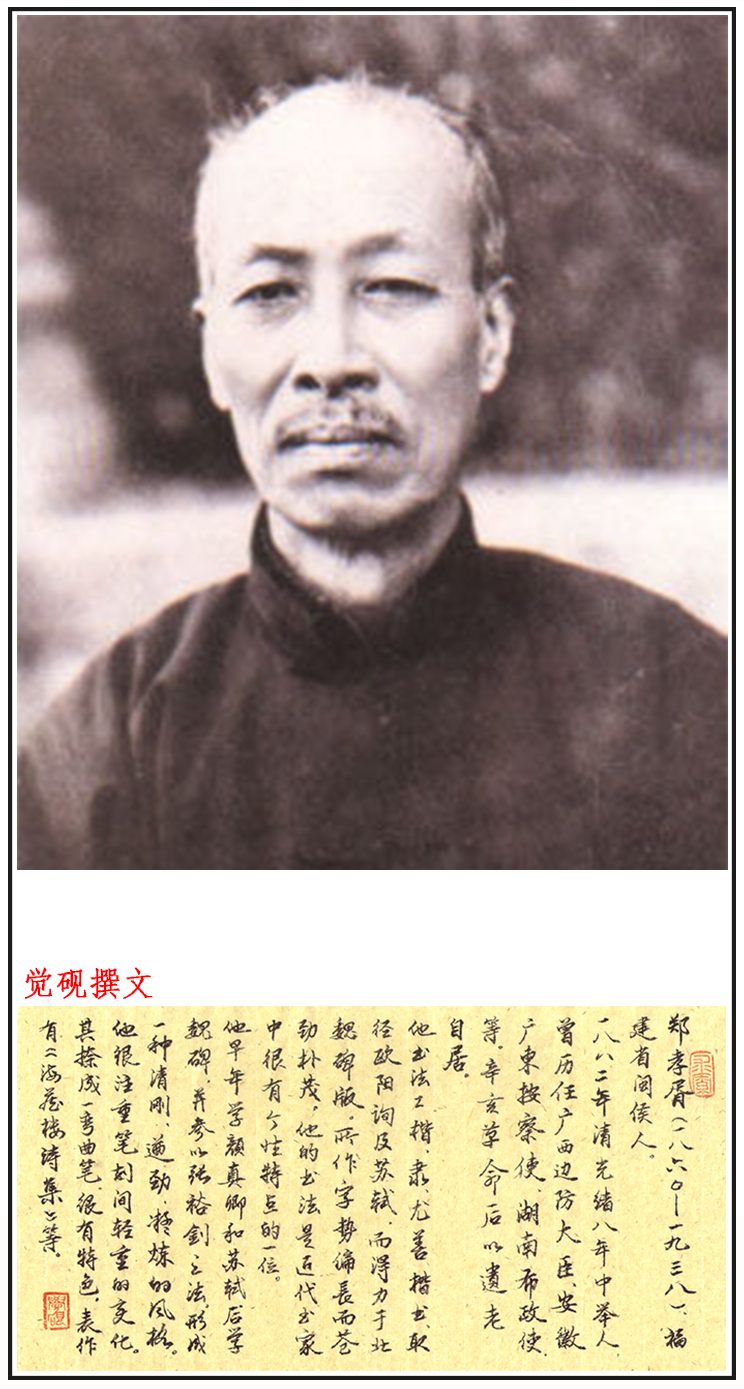 郑孝胥(1860-1938),中国近代的政治人物、书法家。福建省闽侯人。1882年清光绪八年举人,曾历任广西边防大臣,安徽广东按察使,湖南布政使等。辛亥革命后以遗老自居。1932年任伪满洲国总理大臣兼文教总长。善楷书,取径欧阳询及苏轼,得力于北魏碑。所作苍劲朴茂。为诗坛“同光体”倡导者之一。