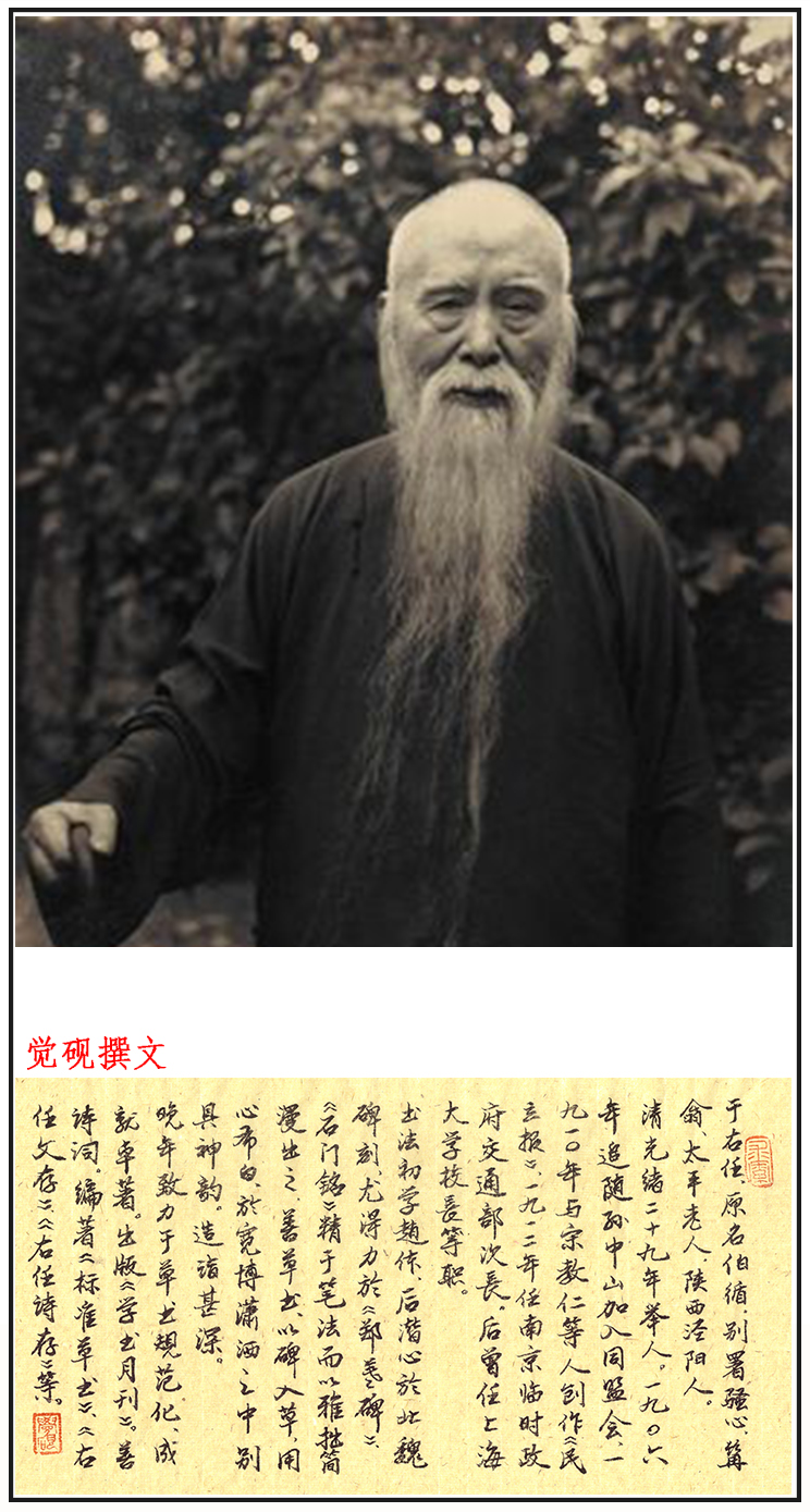 于右任早年是同盟会成员,长年在国民政府担任高级官员,同时也是中国近代书法家,是复旦大学、上海大学、国立西北农林专科学校(今西北农林科技大学)的创办人和复旦大学、私立南通大学校董等。