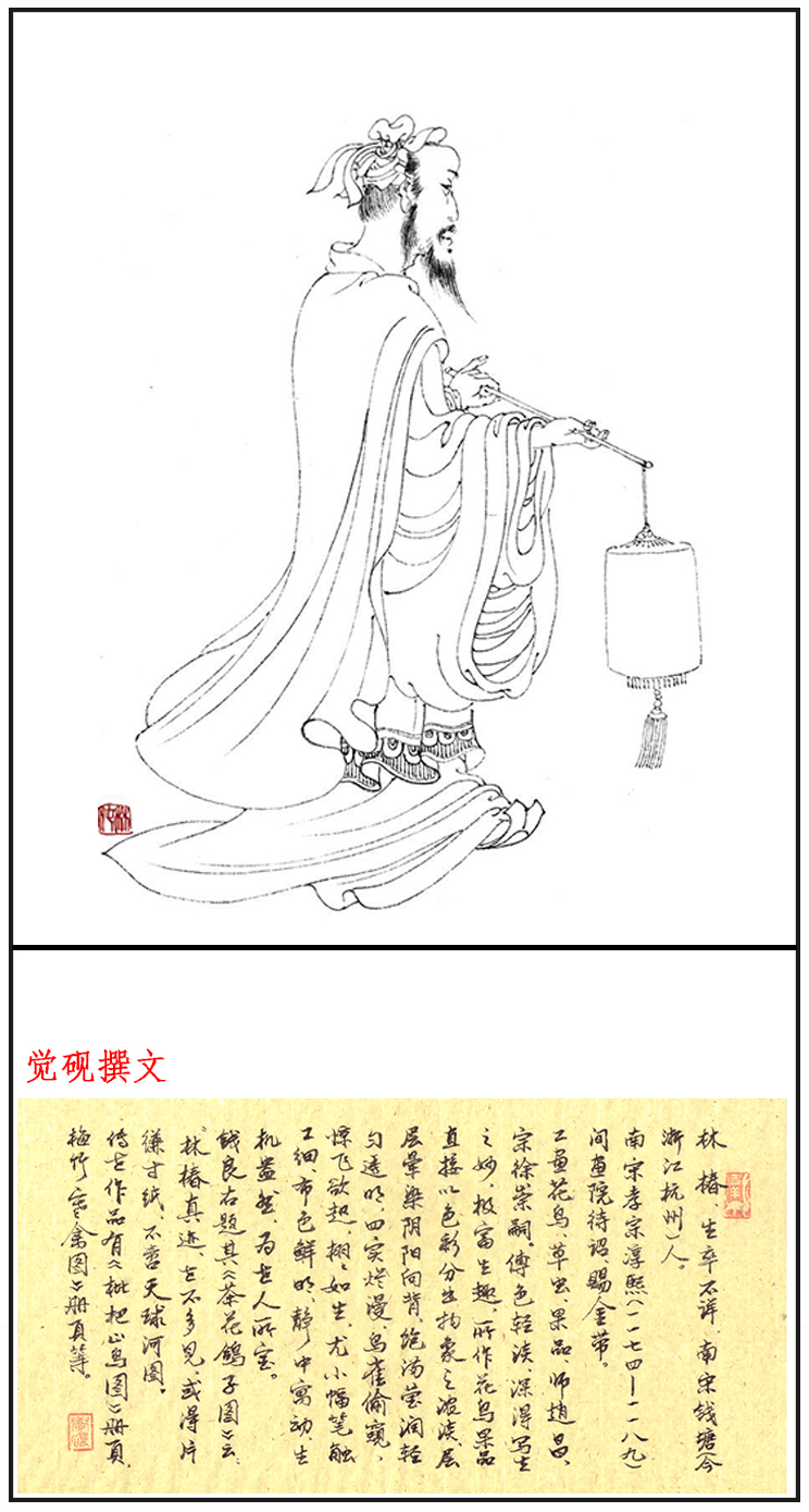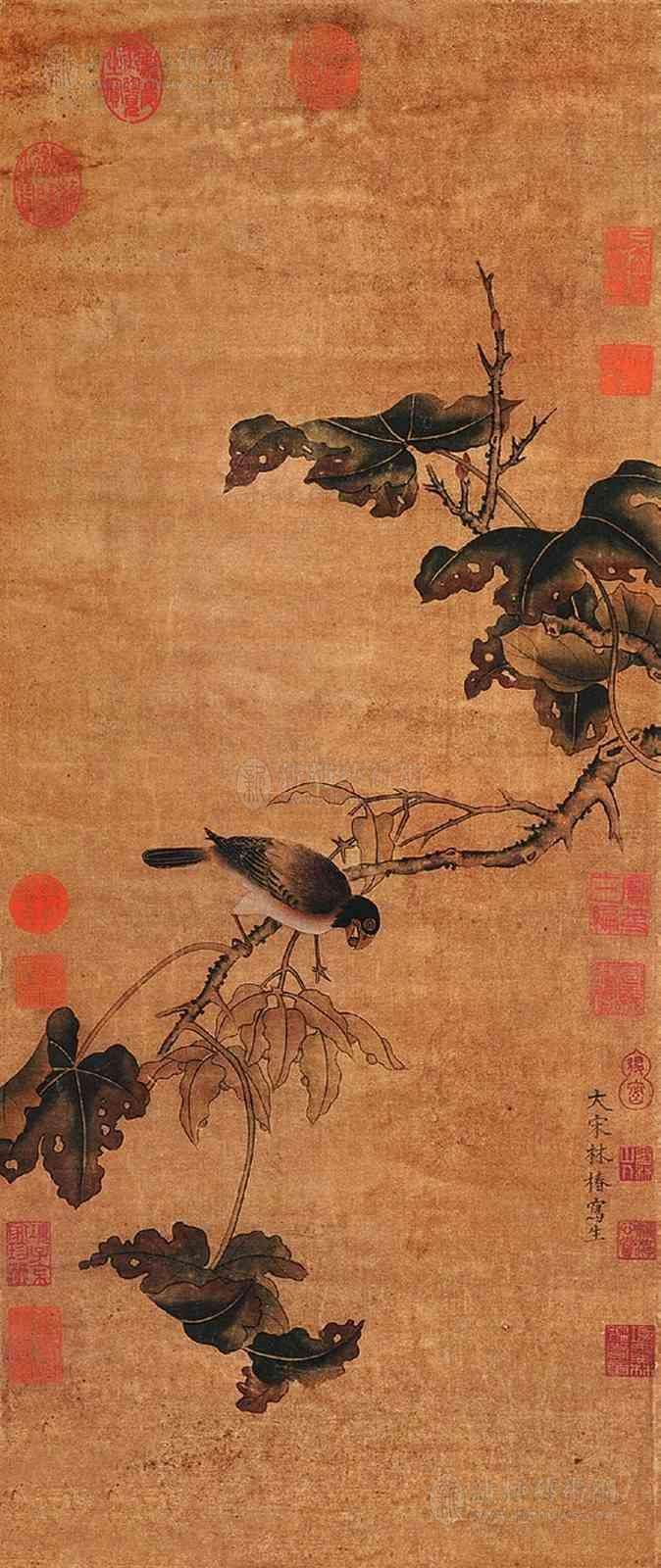 林椿,南宋钱塘(今浙江杭州)人,生卒年不详,南宋孝宗淳熙(1174—1189)间画院待诏,赐金带。 林椿为南宋时期画家,孝宗淳熙年间曾为画院待诏。生卒年不详,浙江钱塘(今浙江杭州)人,南宋时期画家。孝宗淳熙年间曾为画院待诏。绘画师法赵昌,工画花鸟、草虫、果品,设色轻淡,笔法精工,设色妍美,善于体现自然的形态,所绘小品为多,当时赞为“极写生之妙,莺飞欲起,宛然欲活”。传世作品有:《梅竹寒禽图》册页,藏于上海博物馆。《果熟来禽图》、《葡萄草虫》、《枇杷山鸟图》,藏于北京故宫博物院。