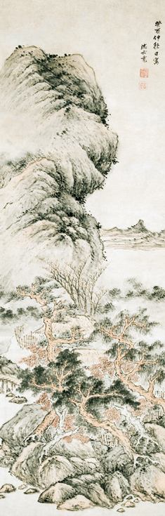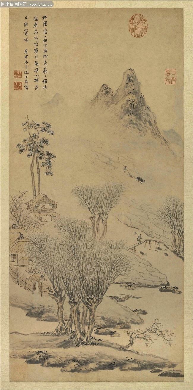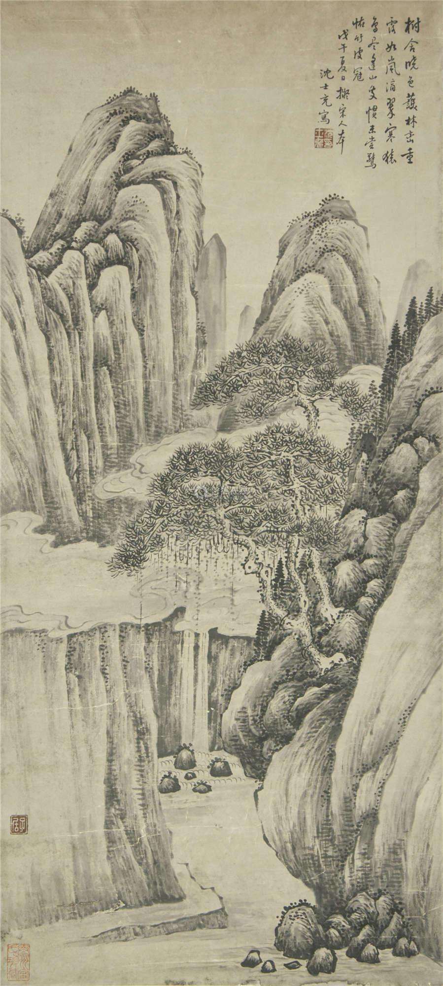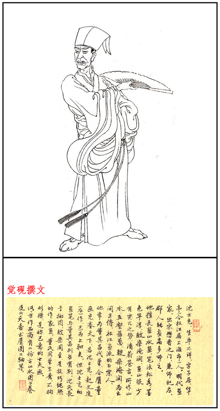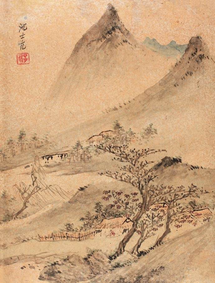 沈士充,明代画家,生卒年不详。字子居,华亭(今松江属上海市)人。出宋懋晋之门,兼师赵左。郡人能画者多师之。他擅长画山水画,笔法松秀,墨色华淳,皴染淹润,画山很少有突兀之势,清蔚苍古.所作山水,丘壑蓓葱,皴染淹润,为云间正传。松江画派的正宗人。他常为董其昌代笔.陈继儒(一五五八-一六三九)札云:“子居老兄:送去白纸一幅,润笔三星,烦画山水大堂。明日即要,不必落款,要董思老出名也。”今赝董画充塞天下,若沈士充、赵文度(左)作,已为上驷矣。万历四十六年(一六一八)作山水扇,见风雨楼扇粹,崇祯六年(一六三三)作寒林浮霭图、四时山水卷。《明画录、无声诗史、图绘宝鉴续纂、桐阴论画、松江志》。