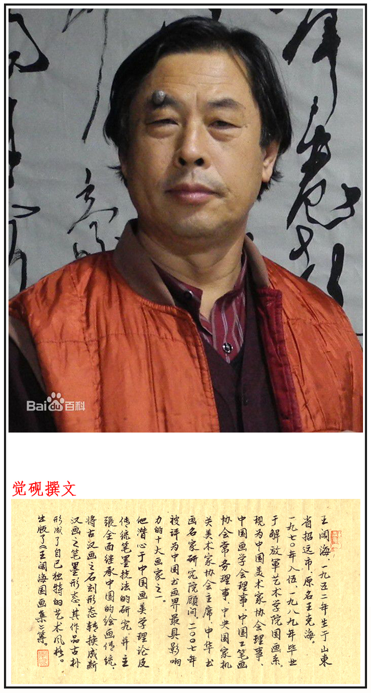 王阔海,原名王克海,1952年生于山东省招远市,1970年入伍,1989年毕业于解放军艺术学院国画系。现为中国美术家协会理事,中国画学会理事,中国工笔画协会常务理事,第二炮兵政治部创作室专职画家,中央国家机关美术家协会主席,中华书画名家研究院顾问。国家一级美术师,中国汉画艺术研究院院长。2007年被评为中国书画界最具影响力的十大画家之一。
