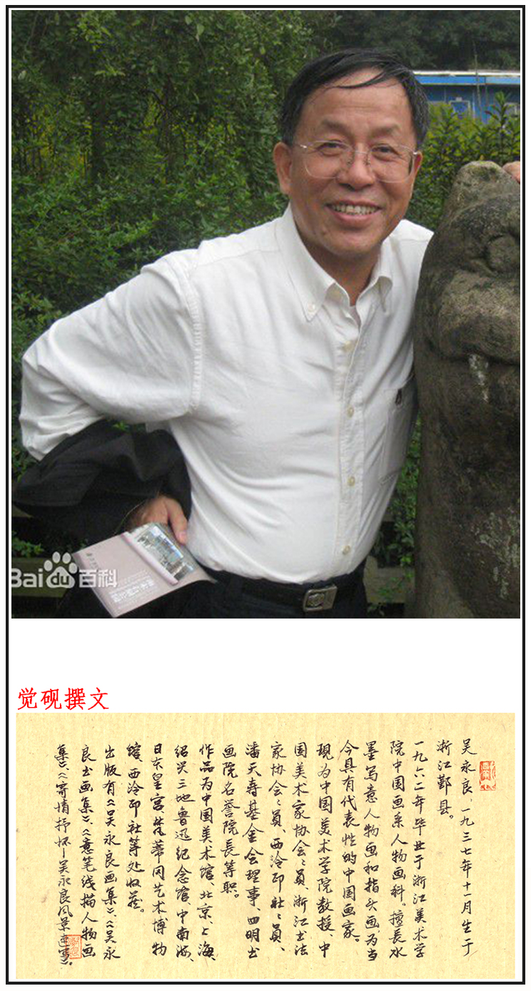 吴永良,1937年11月生于浙江鄞县。1962年毕业于浙江美术学院中国画系人物画科。擅长水墨写意人物画和指头画,为当今具有代表性的中国画家,在意笔线描人物画教学和创作上具率先独创之学术成就。作品为中国美术馆、北京、上海、绍兴三地鲁迅纪念馆,中南海,日本皇宫,梵蒂冈艺术博物馆,西泠印社等处收藏。出版有《吴永良画集》、《吴永良书画集》、《寄情抒怀-吴永良风景速写》等。电视专题片《吴永良画鲁迅》、《艺术与心灵—吴永良教授画牛》由中央和浙江电视台多次播放并选送至美国、日本、澳大利亚播映。业绩入编《中国美术全集·现代卷》、《当代中国美术全集》,享受政府特殊津贴。现为中国美术学院教授、中国美术家协会会员、浙江书法家协会会员、西泠印社社员、潘天寿基金会理事、四明书画院名誉院长、新加坡墨澜社、啸涛篆刻书画会等艺术顾问。