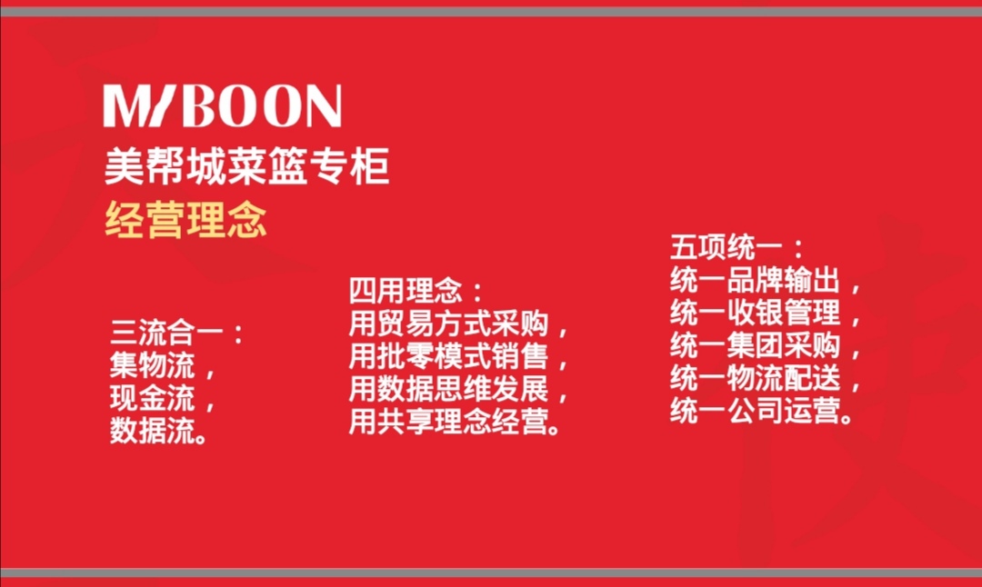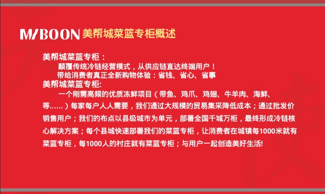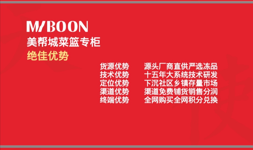 公司凭借十多年的ERP系统研发经验,以及专业的运营管理团队、优秀的供应链资源推出美帮城菜篮专柜,为国内庞大的乡镇地区提供优质的冷链食材,让冷链食材更接近乡镇、更实惠消费者、更贴心服务大众。