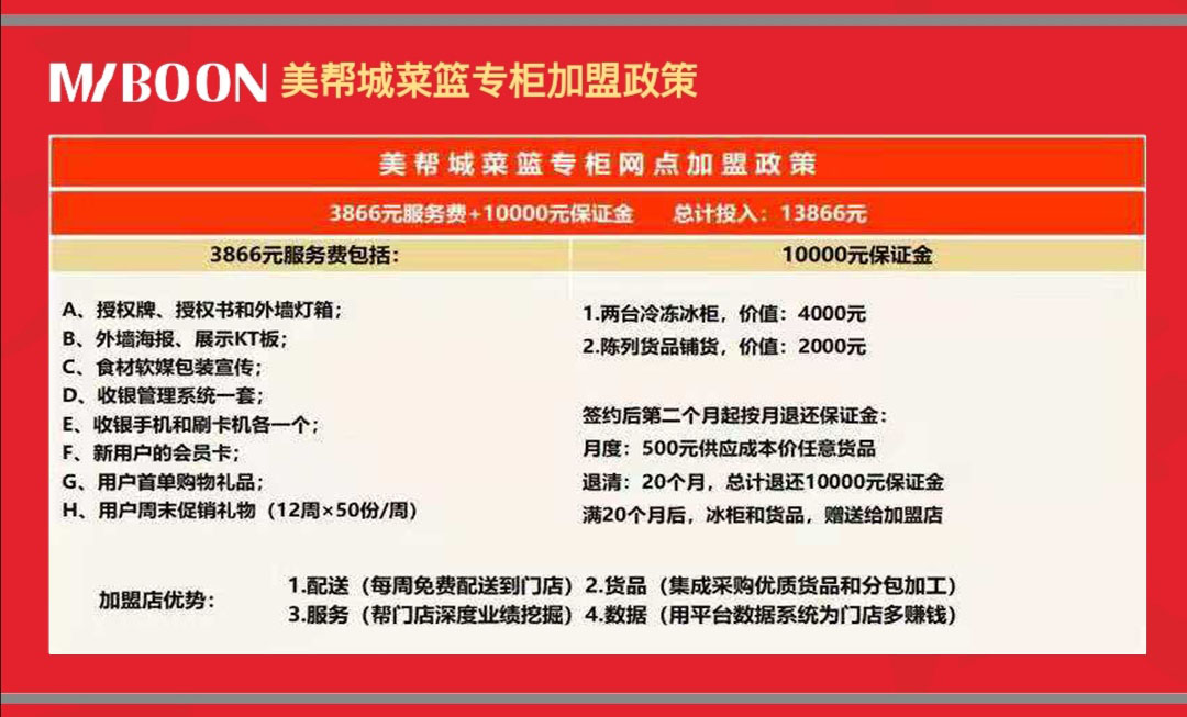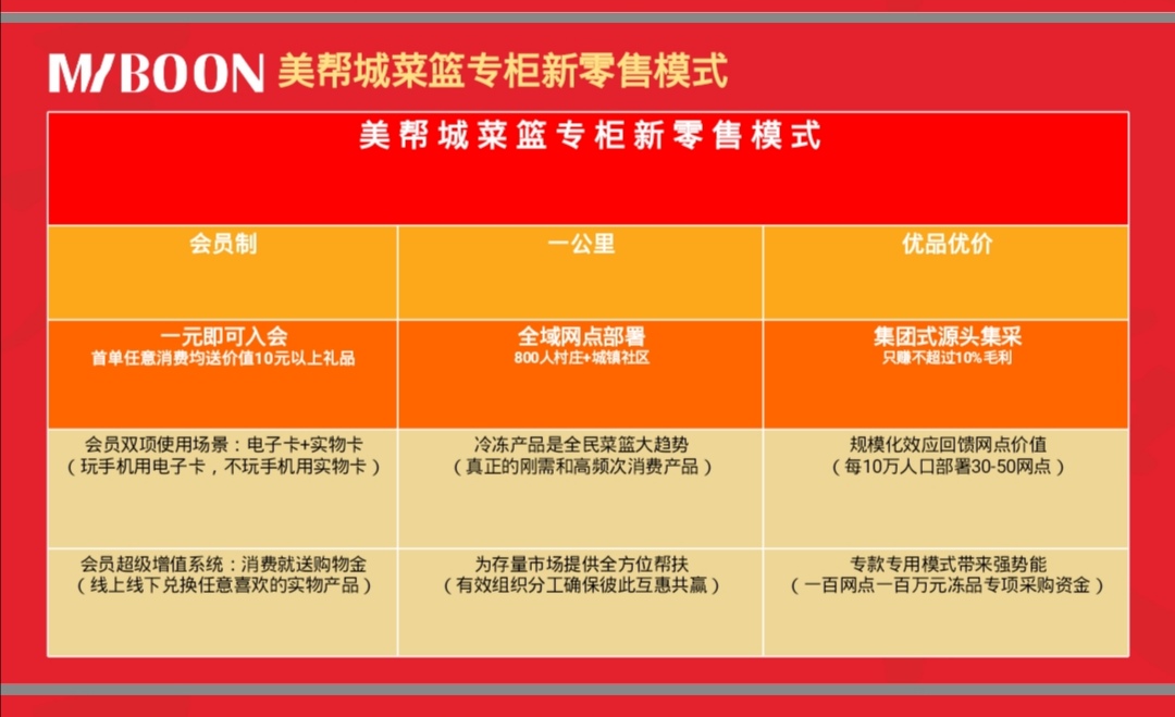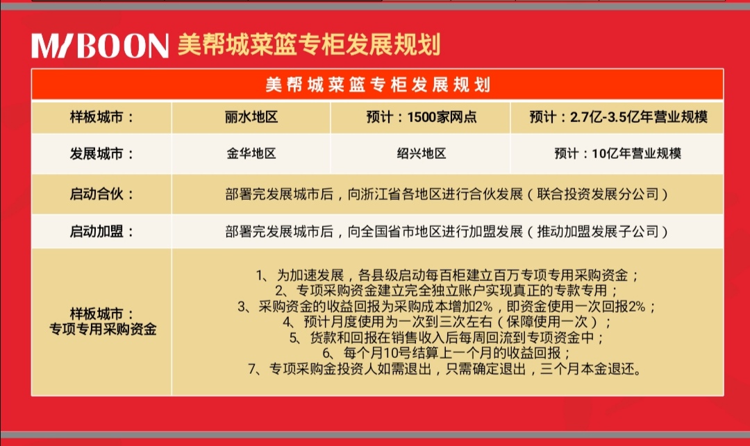 美帮城目标在2020年6月前建设完成丽水地区1500个美帮城菜篮专柜乡镇网点,并在2020年年底前同步启动浙江省三个地级城市5000个网点落地。公司的口号是:千城万柜、冷链惠家
