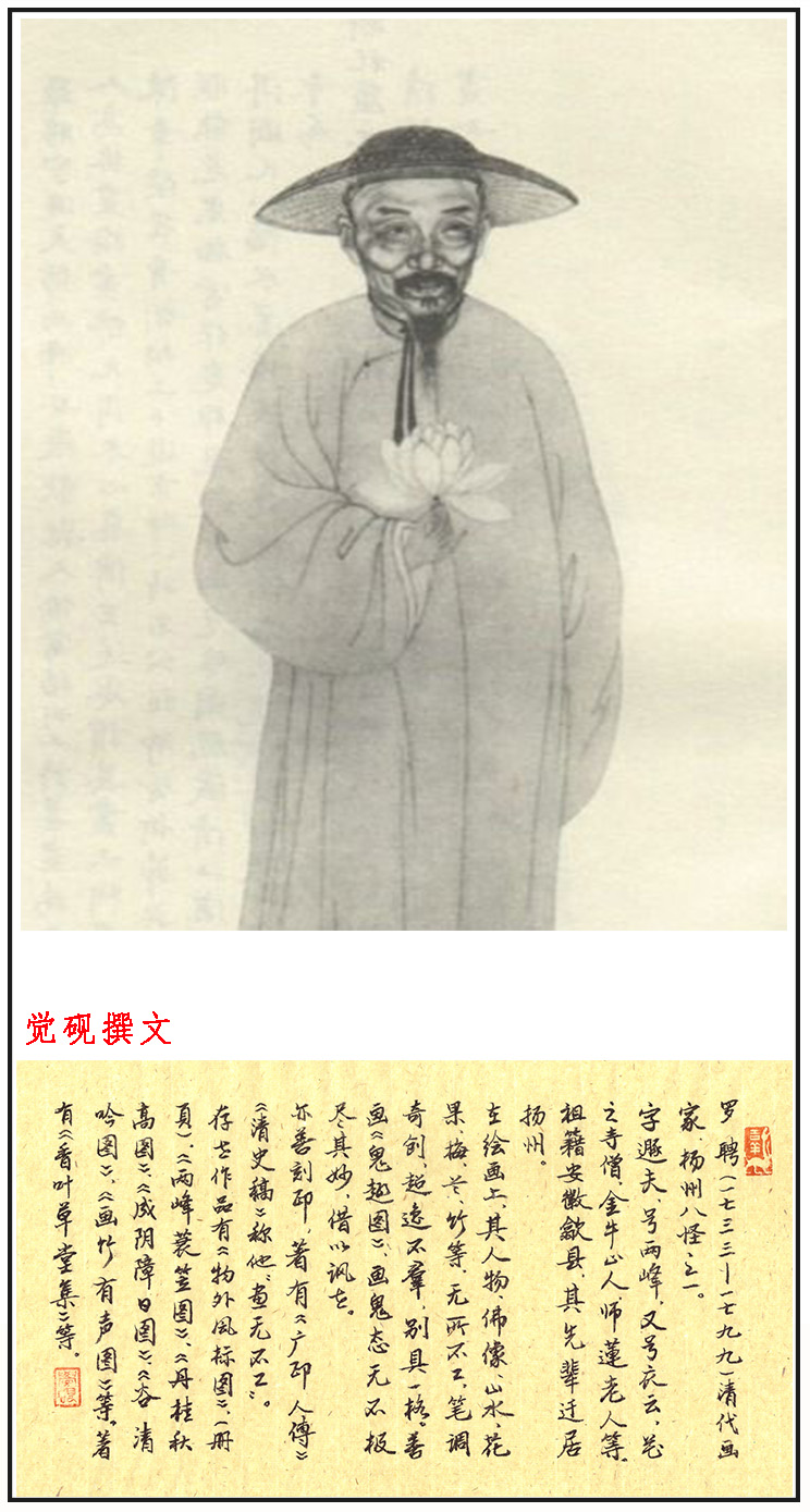 罗聘(1733-1799),清代画家,“扬州八怪”之一。字遯夫,号两峰,又号衣云、花之寺僧、金牛山人、师莲老人等。祖籍安徽歙县,其先辈迁居扬州。为金农入室弟子,布衣,好游历。