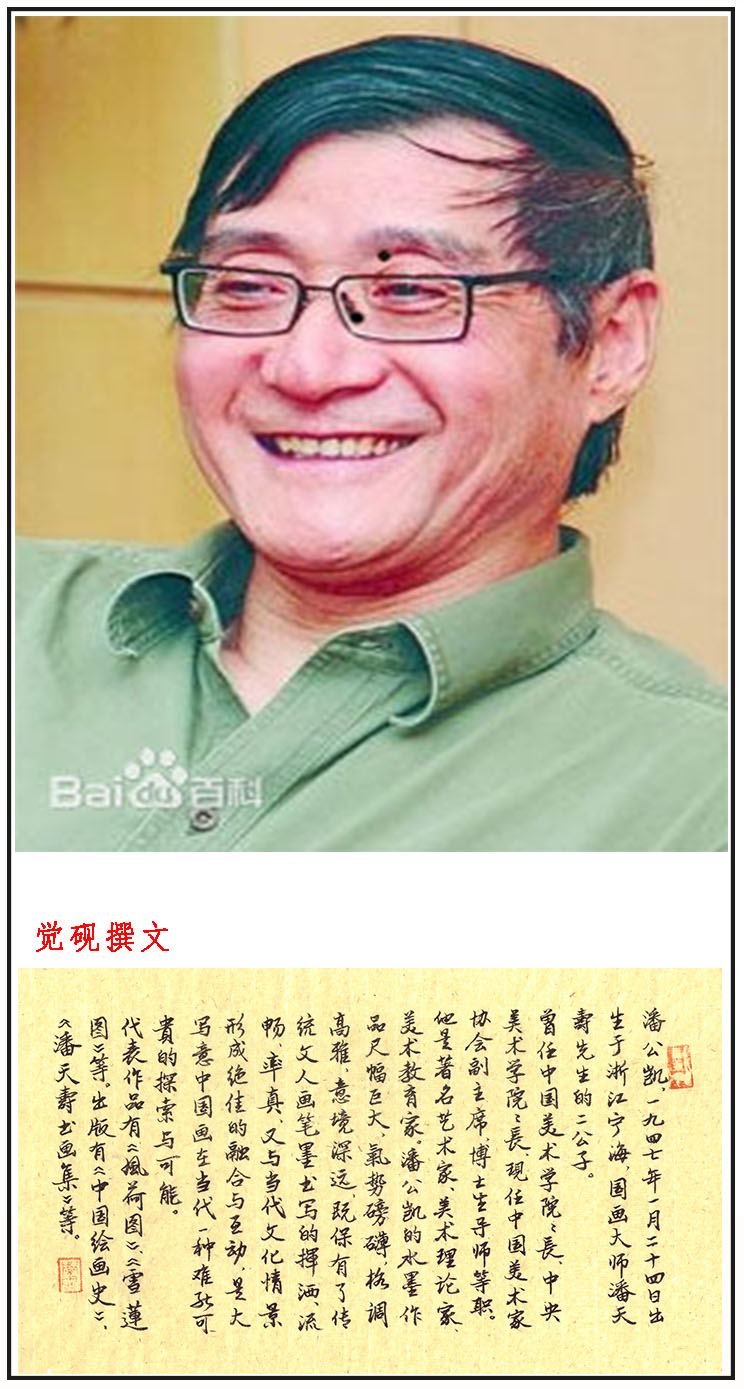 潘公凯,1947年1月24日出生于浙江宁海,国画大师潘天寿先生的二公子。1996年任中国美术学院院长,2001年6月至2014年9月,任中央美术学院院长 [1] ,现任中国美术家协会副主席,国务院新闻办《中国网》专栏作家、专家等。教授在任中国美术学院院长和中央美术学院院长的同时也是博士生导师,自1979年以来一直担任中国画创作和美术史论教学工作,1992年5月至1994年1月曾赴美国伯克利大学研访。出版论文集《限制与拓展》、专著《潘天寿评传》、《潘天寿绘画技法解析》;主编《潘天寿书画集》(获国家图书奖)、《现代设计大系》;编撰《中国绘画史》。