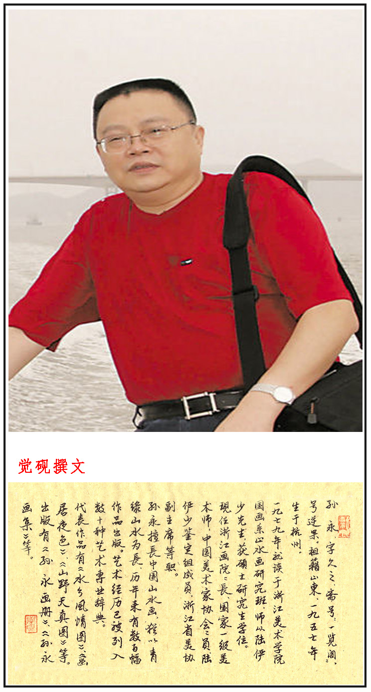 孙永,字久之,斋号“一览阁”,号逆果。祖籍山东,1957年生于杭州,1965年—1970年就读于杭州市庆春门小学。1971年—1975年就读于杭州市第九中学。1976年—1978年毕业于浙江省萧山县。1979年至1981年就读于浙江美术学院国画系山水画研究班,师从于陆俨少先生。 获硕士研究生学位,浙江画院院长,国家一级美术师,中国美术家协会会员,浙江省艺术类高级技术职称评委,陆俨少鉴定组成员。浙江省美术家协会副主席。