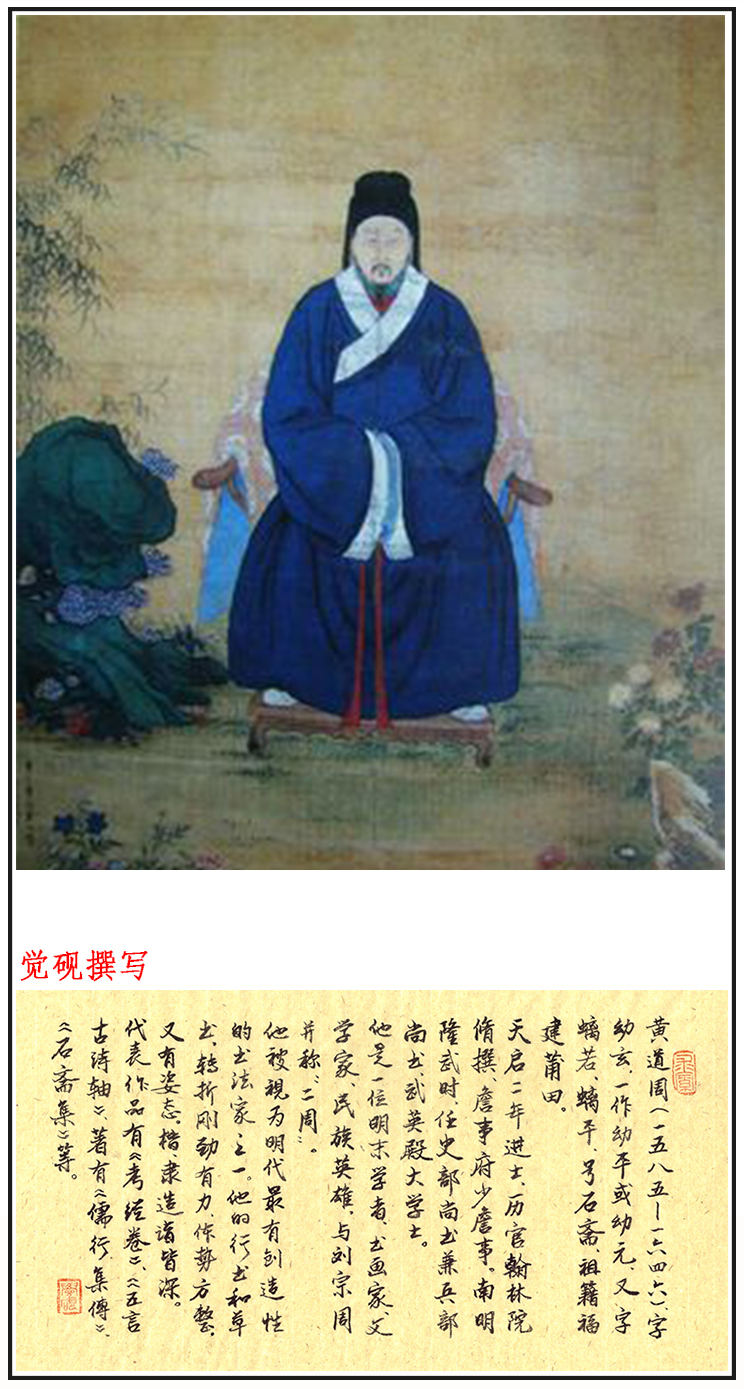黄道周(1585年3月9日 [1] —1646年4月20日 [1] ),字幼玄,一作幼平或幼元,又字螭若、螭平,号石斋,福建漳州府漳浦县(今福建省东山县铜陵镇)人, 祖籍福建莆田,其曾祖从莆田迁徙至漳州。天启二年(1622年)进士,改庶吉士,深得考官袁可立赏识。历官翰林院修撰、詹事府少詹事。南明隆武(1645年-1646年)时,任吏部尚书兼兵部尚书、武英殿大学士(首辅)。因抗清失败被俘。隆武二年(1646年)壮烈殉国,隆武帝赐谥“忠烈”,追赠文明伯。清乾隆四十一年(1776年)追谥“忠端”。为明末学者、书画家、文学家、民族英雄。与刘宗周并称“二周”。