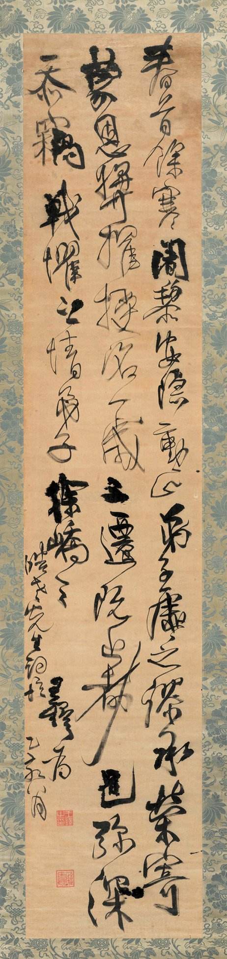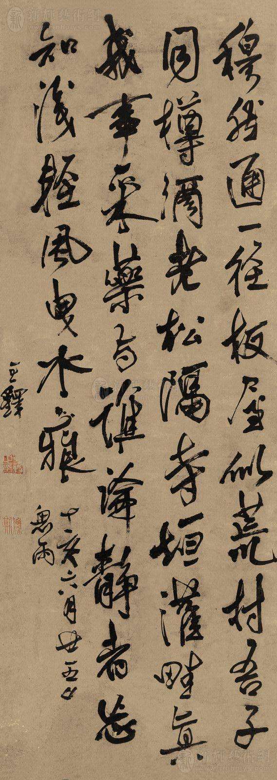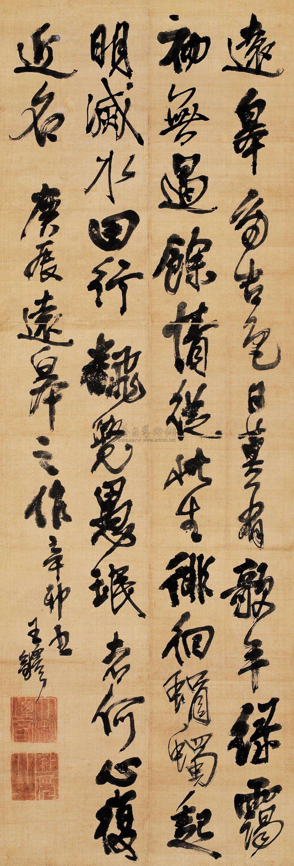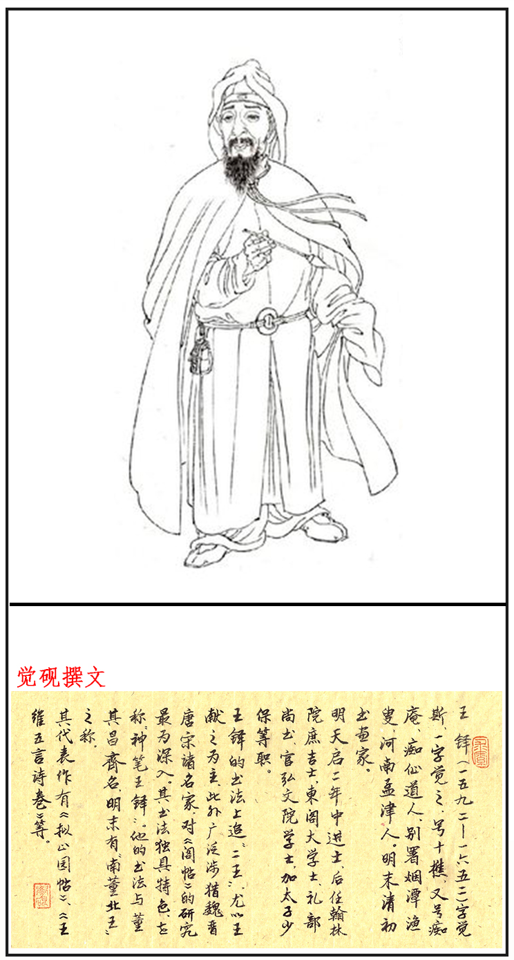 王铎(1592—1652),字觉斯,一字觉之,号十樵、嵩樵, 又号痴庵、痴仙道人,别署烟潭渔叟,河南孟津人 [1] 。明末清初书画家 。他的书法与董其昌齐名,有“南董北王”之称 [2] 。北京大学教授、引碑入草开创者的李志敏评价:“王铎的草书纵逸,放而不流,纵横郁勃,骨气深厚”。 [3] 明天启二年(1622年)中进士,受考官袁可立提携,入翰林院庶吉士,累擢礼部尚书。崇祯十六年(1643年),王铎为东阁大学士。崇祯十七年(清世祖顺治元年,1644年)满清入关后被授予礼部尚书、官弘文院学士,加太子少保,于清顺治九年(1652年)病逝故里。享年六十一岁,葬于河南巩义洛河边,谥文安。