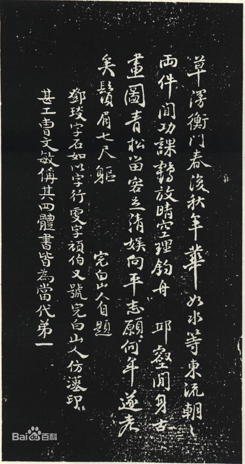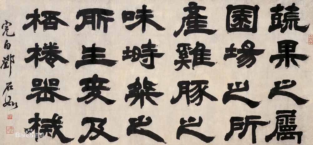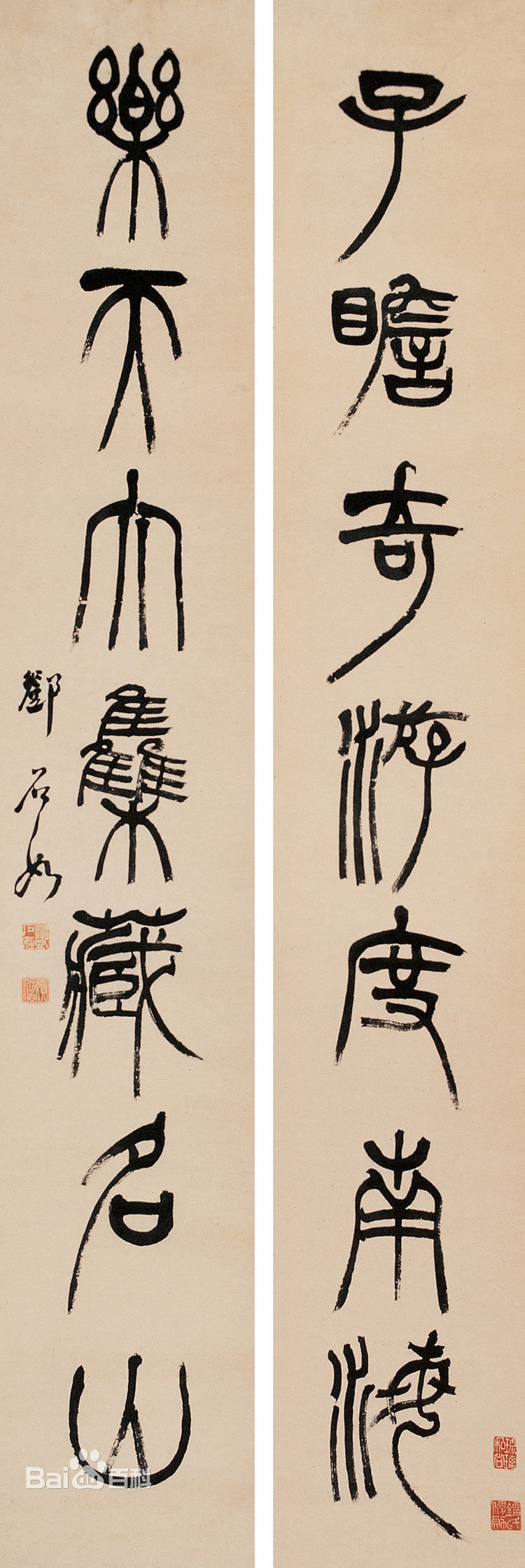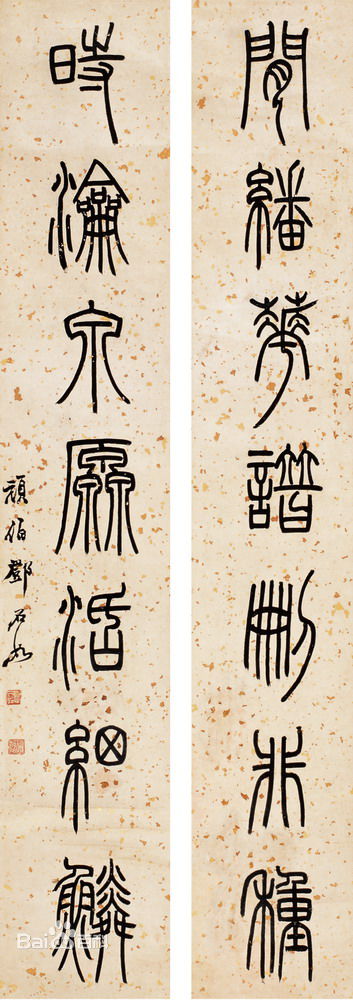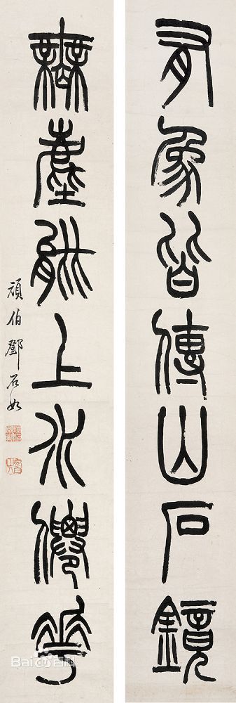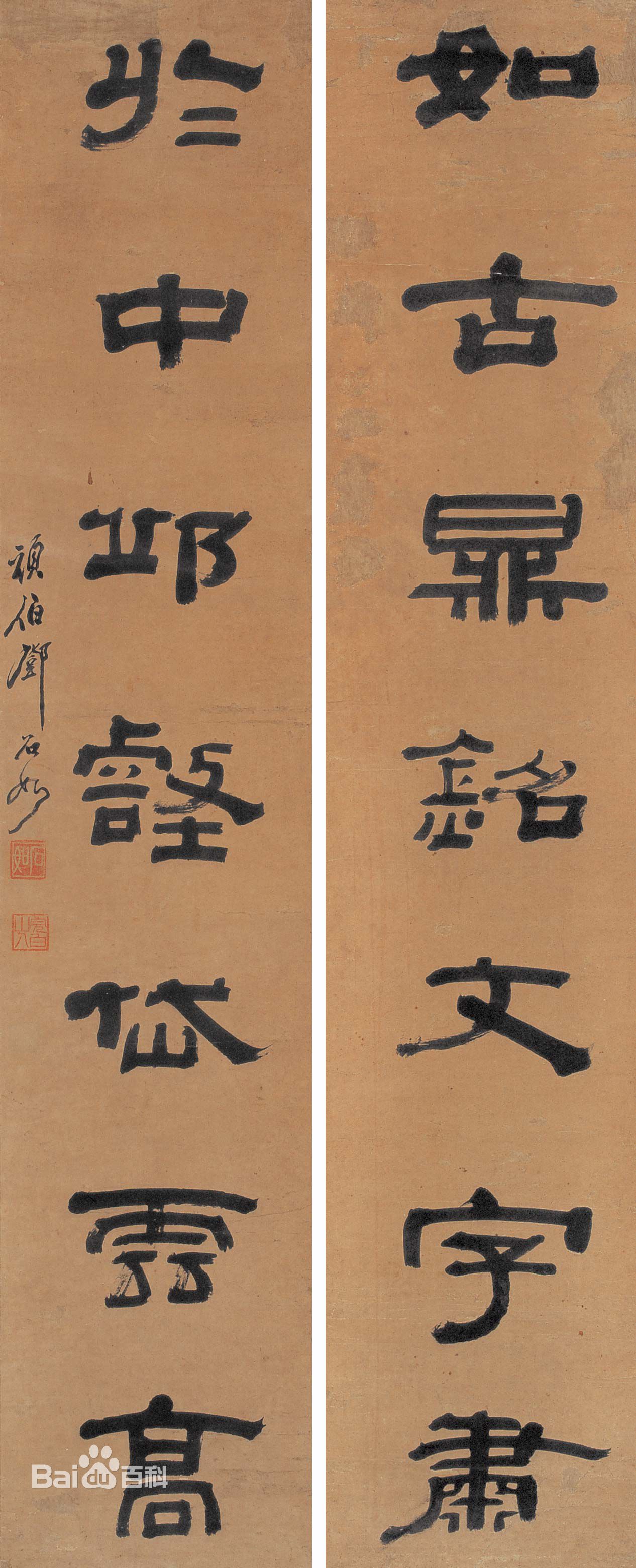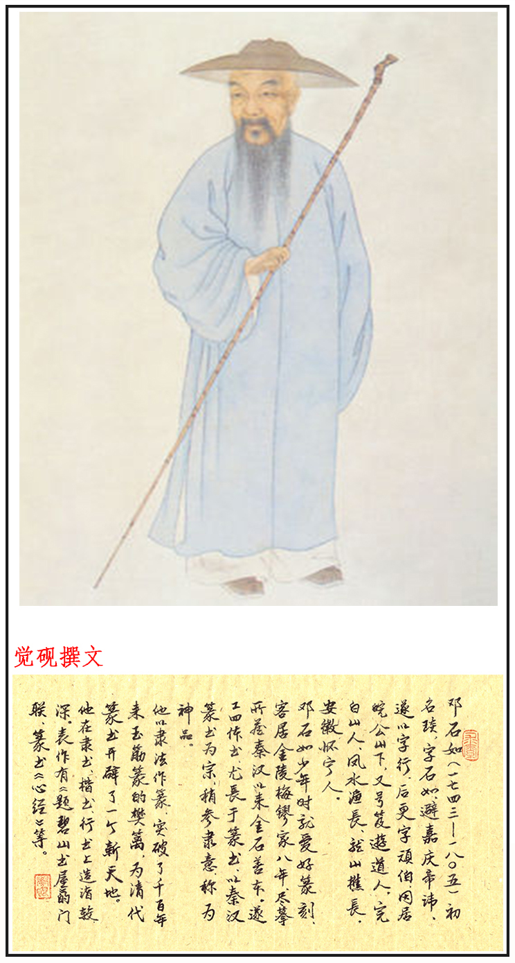 邓石如(1743—1805),安徽怀宁县白麟畈(今安庆市宜秀区五横乡白麟村)邓家大屋人。清代篆刻家、书法家,邓派篆刻创始人。初名琰,字石如,避嘉庆帝讳,遂以字行,后更字顽伯,因居皖公山下,又号笈游道人、完白山人、凤水渔长、龙山樵长,少好篆刻,客居金陵梅镠家八年,尽摹所藏秦汉以来金石善本。遂工四体书,尤长于篆书,以秦李斯、唐李阳冰为宗,稍参隶意,称为神品。性廉介,遍游名山水,以书刻自给。有《完白山人篆刻偶存》。