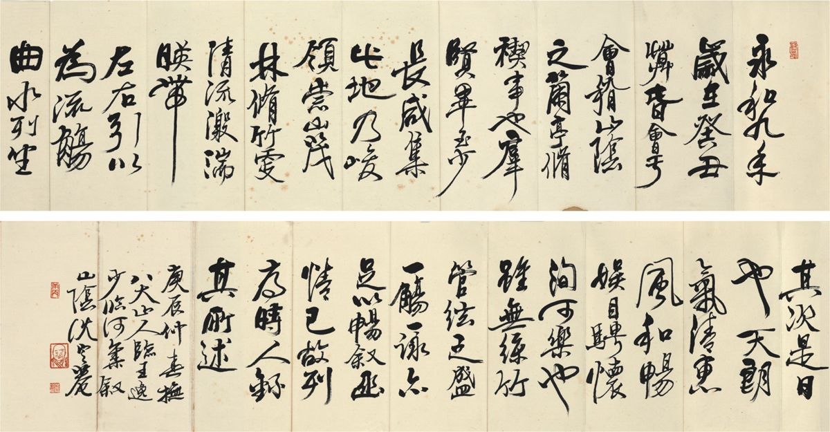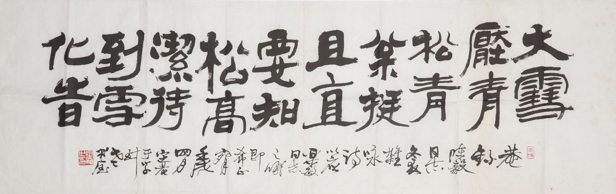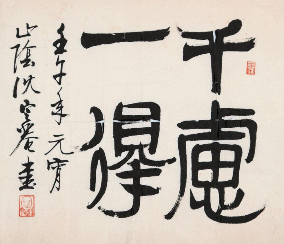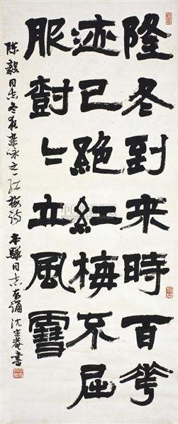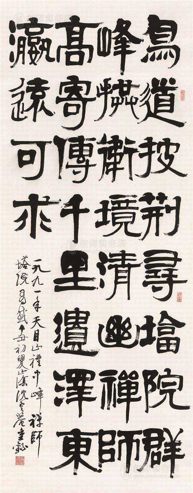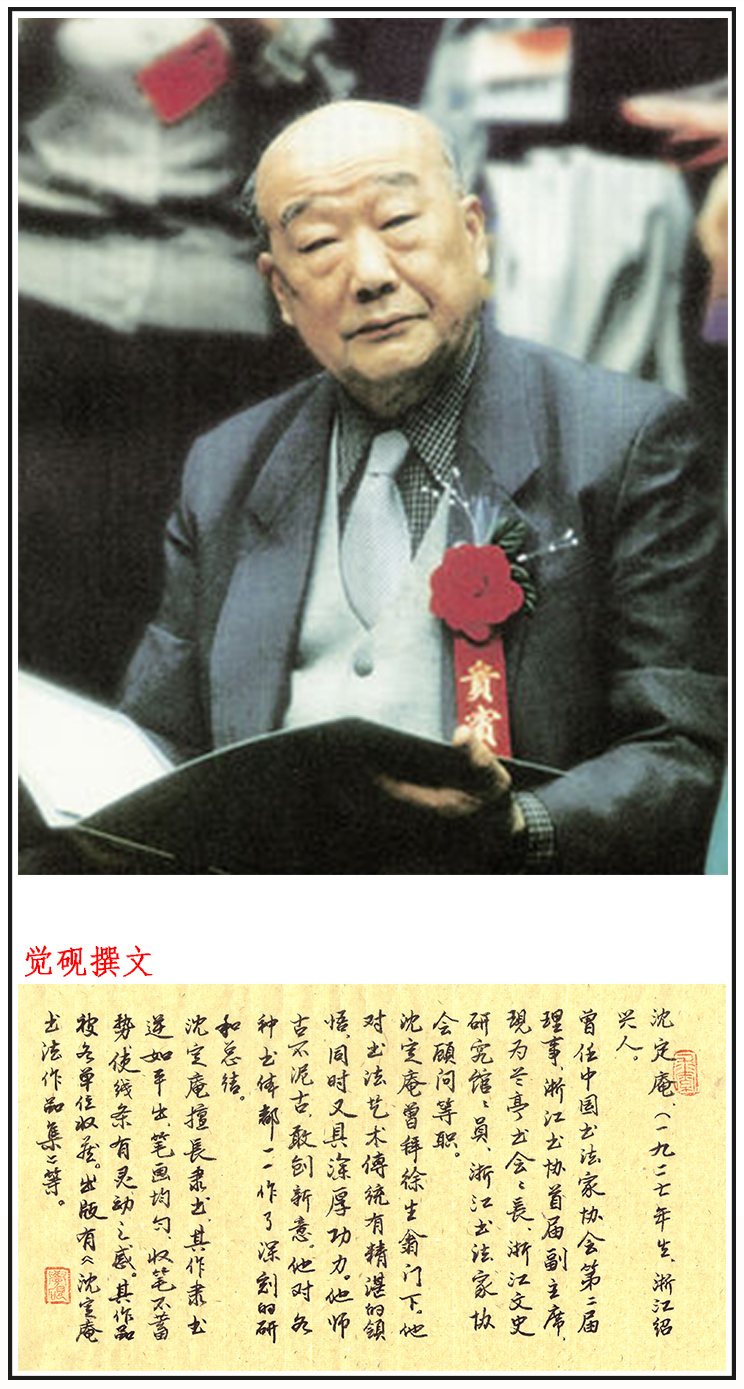 沈定庵(1927——),浙江绍兴人,曾拜徐生翁门下。他对书法艺术传统有精湛的领悟,同时又具深厚功力。他我行我素,师古不泥古,敢创新,正如其性格一样,在艺术上同样是嶔崎耿介;还有重要一条,就是他广博的学识与多方面的素养。”沈定庵对徐生翁书法创作成就的归纳,其实也是对自己在书法艺术追求中的总结。沈定庵所谈的“三大要素”,何尝不是组成自己书法的三大要素。
