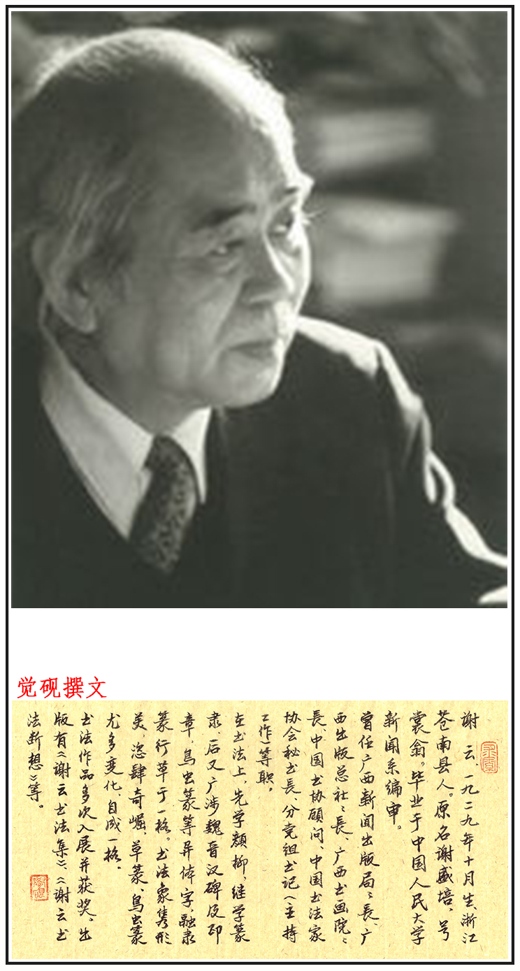 谢云,汉族,1929年10月生,浙江苍南县人。原名谢盛培,号裳翁。毕业于中国人民大学新闻系。编审。中国书法家协会顾问,中国作家协会会员 [1] 。1991年中国书法家协会第三届换届,被选为秘书长,并任中国书法家协会分党组幅书记(主持工作),至2000年卸任。 长期从事出版工作,曾任广西新闻出版局局长,广西出版总社社长、中共广西自治区党委宣传部副部长、广西书画院院长,中国出版工作者协会常务理事。创办线装书局,任首任总经理、总编辑。