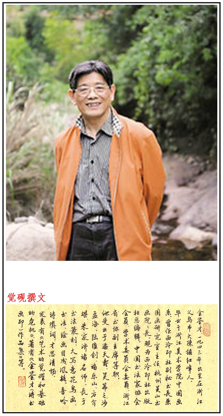 金鉴才,知名书法家,义乌市大陈镇红峰人,先世本姓刘,后改金姓,毕业于浙江美术学院中国画系。曾任西泠印社副秘书长兼国画研究室主任,省文史研究馆馆员,省文物鉴定委员会委员,杭州吴山书画院院长。现为西泠印社出版社总编辑。中国书法家协会会员、中国书法家协会学术委员会委员,浙江省书法家协会副主席,浙江省中国花鸟画家协会副会长兼秘书长,中国美术学院特聘教授。工行书及篆刻。作品多次参加国内外重大书展。编著有《梅》、《竹》、《兰》、《菊》技法画谱和《金鉴才作品集》等。