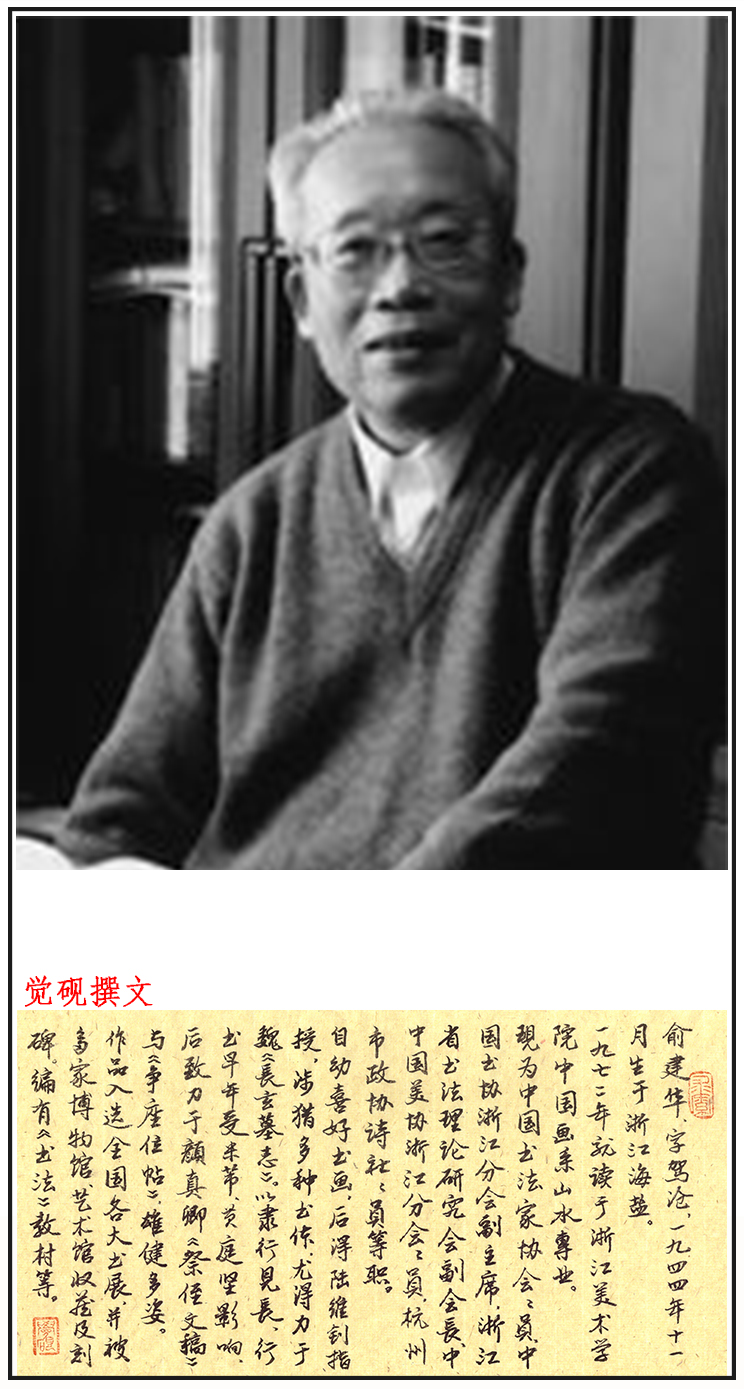 俞建华,字驾沧,男,汉族,1944年11生于浙江海盐。1972年就读于浙江美术学校中国画系山水专业,1976年毕业后在浙江人民出版社和浙江人民美术出版社任美术编辑。自幼喜好书画,后得陆维钊指授,涉猎多种书体,尤得力于魏《长玄墓志》。以隶、行见长,隶书出入于汉《礼器碑》、《张迁碑》与清人伊秉绶,得沉雄朴茂之致,行书早年受米芾、黄庭坚影响,后致力于颜真卿《祭侄文稿》与《争座位帖》,雄健多姿。作品入选全国第一、二届中青年书法篆刻作品展览、河南"国际书法展览"、1987年“第四回中日兰亭笔会”等,被收入多种作品集,在专业报刊发表或被博物馆、艺术馆收藏及刻碑。热心于老年书画教学工作,编有《书法》教材。