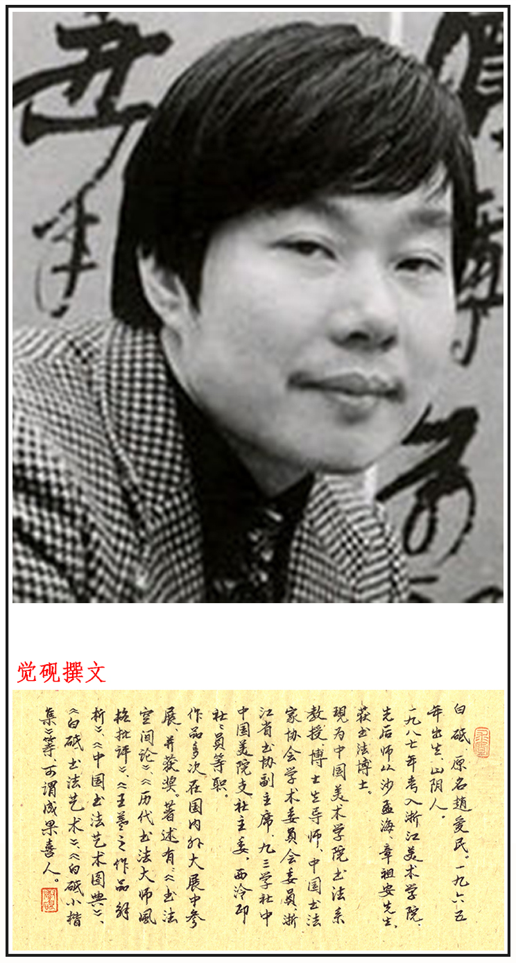 白砥,原名赵爱民。1965年生,山阴人。现为中国美术学院书法系教授、博士生导师,鲁迅美术学院、山东艺术学院客座教授,中国书法家协会学术委员会委员,浙江省文联委员,浙江省书法家协会副主席,九三学社中国美术学院支社主委,西传印社社员。出版发表书法作品上千幅,参加国内外大型展览上百次,举办个展16次。