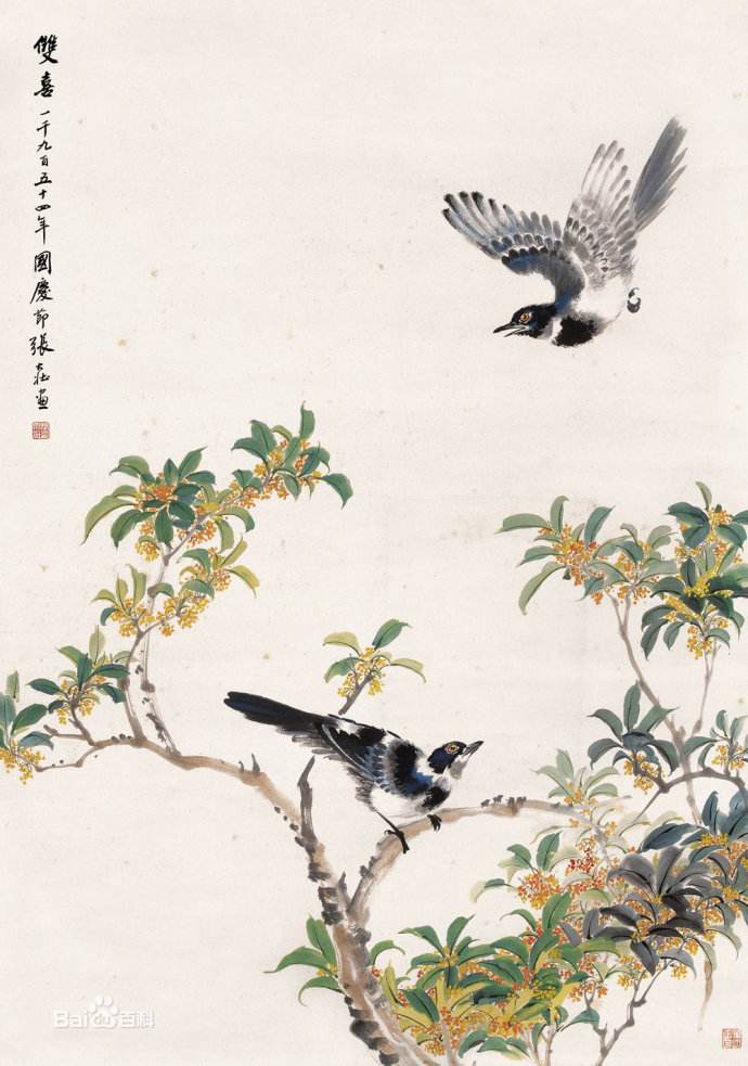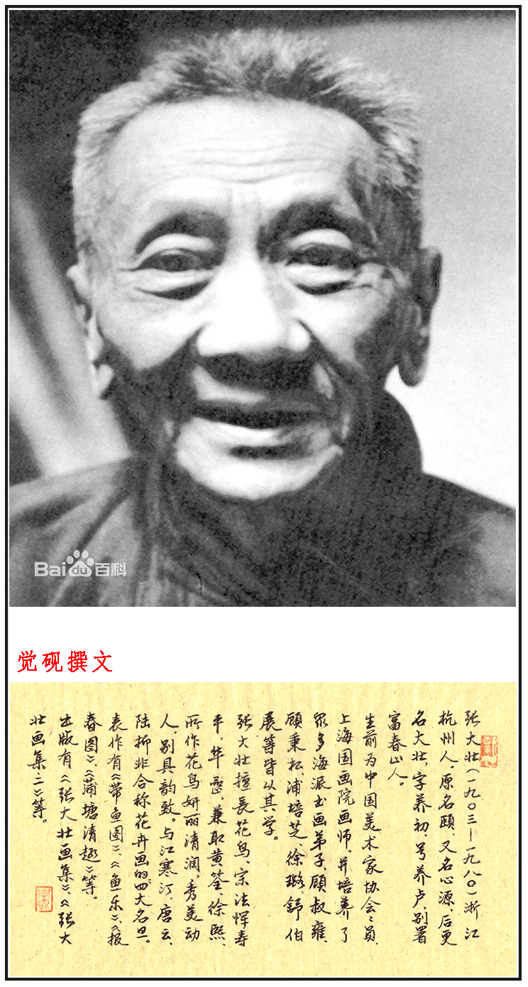 张大壮(1903—1980)浙江杭州人。原名颐,又名心源,后更名大壮,字养初,号养卢,别署富春山人。章炳麟(太炎)外甥。与江寒汀、唐云、陆抑非合为现代四大花鸟画家,被合称花卉画的四大名旦。