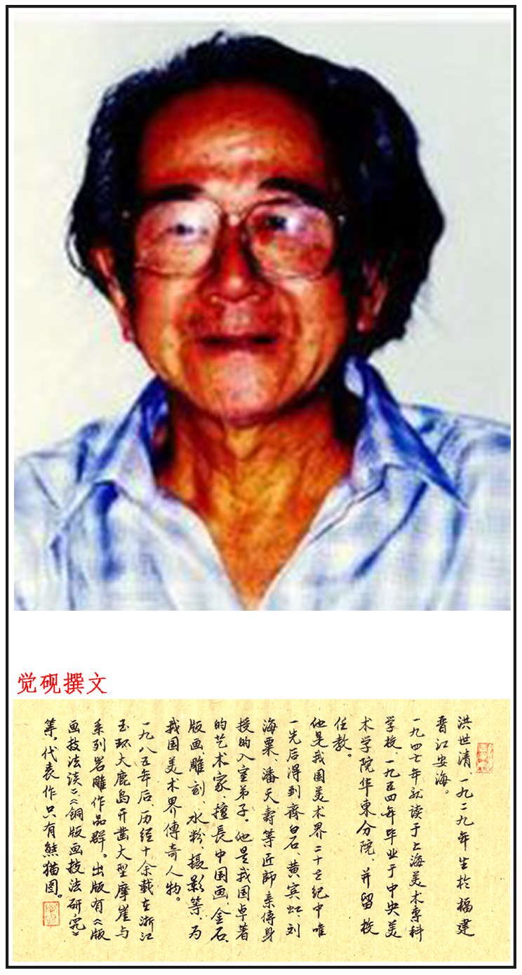 洪世清(1929-2008 ) 福建晋江人。1954年毕业于中央美术学院华东分院,留校任教。早年多作版画,著有《石版画技法研究》等。后攻中国画,曾得黄宾虹、潘天寿、刘海粟诸家指点,尤致力于指画创作。1985年起,先后在浙江大鹿岛、福建崇武半岛创作大型岩雕两百余件。其岩雕以海生动物为题材,取法秦汉雄风,顺势布局,因石赋形,略施斤斧,人天同构,极见粗犷浑厚、苍莽奇崛之气象。洪世清于1996年获鲁迅版画奖,1997年获鲁迅文学艺术奖。