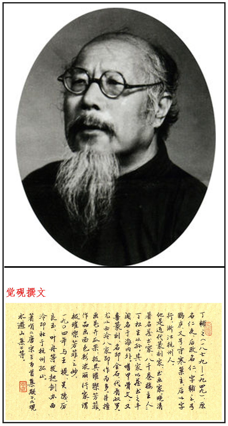 丁辅之(1879年8月14日~1949年7月12日),近代篆刻家、书画家。原名仁友,后改名仁,字辅之,号鹤庐,又号守寒巢主,后以字行。浙江杭州人,系晚清著名藏书家“八千卷楼主人”丁松生从孙。其家以藏书之丰闻名于海内。嗜甲骨文,尝以甲骨文撰书楹联编成册,又喜篆刻,名印金石,代有收罗,尤以西泠八家印作为多。并擅画花卉瓜果,极其璀璨芳菲。幼承家学。一度同王禔供职于沪杭铁路局。公余之暇,探讨金石书画。