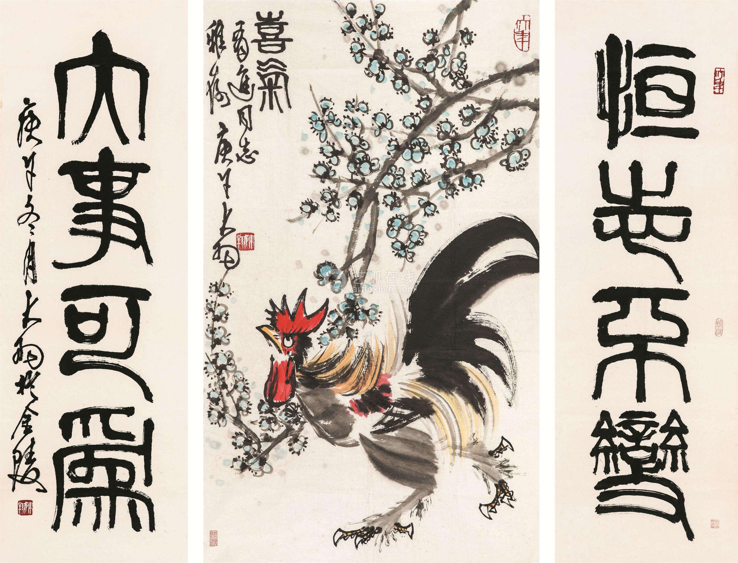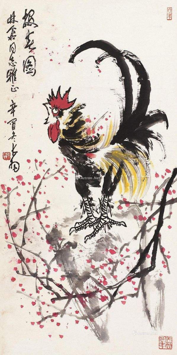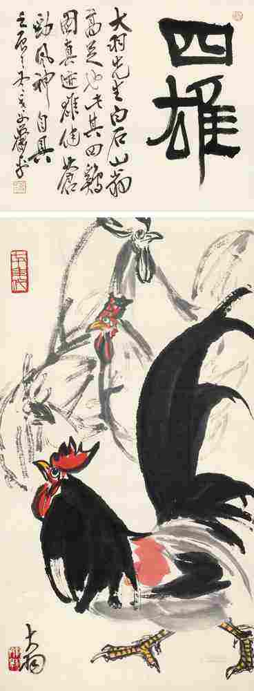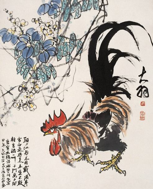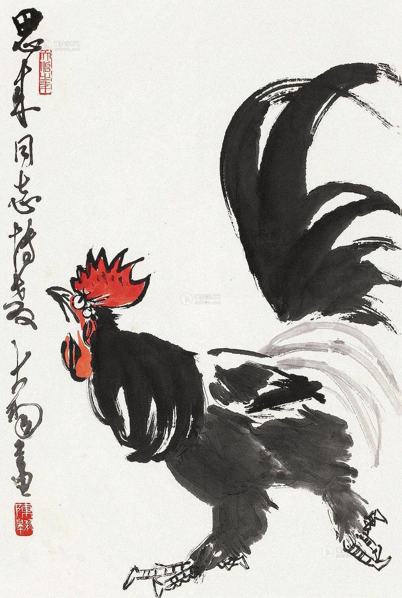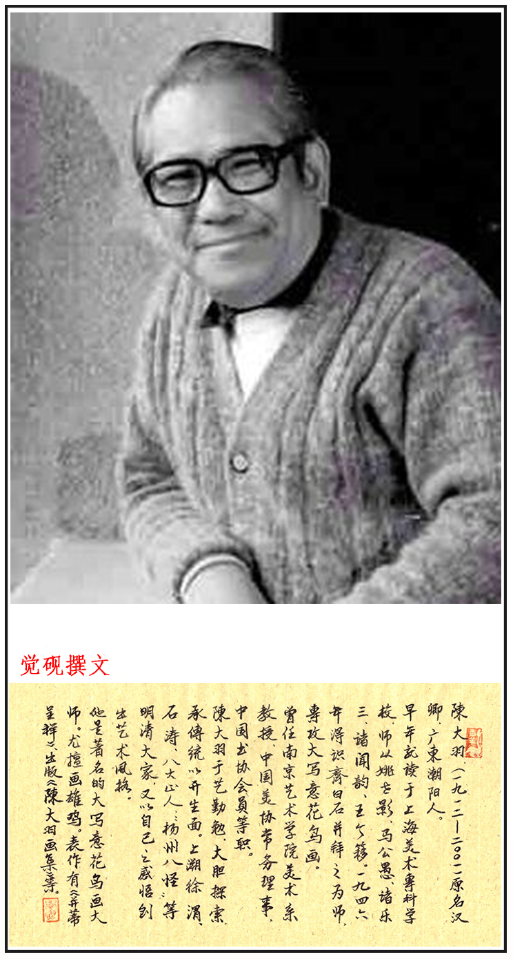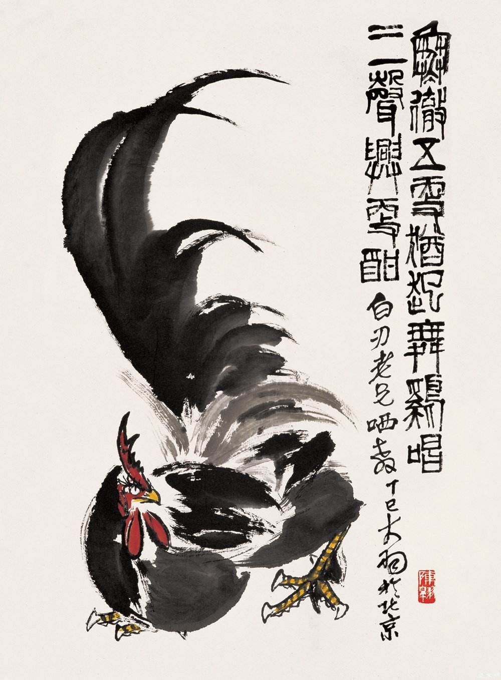 陈大羽(1912-2001)著名大写意花鸟画大师,书法家、篆刻家。以大写意花鸟而著称,尤擅画雄鸡,兼及山水、人物,作品气势宏伟,笔力雄健,浑厚酣畅。他对大写意花鸟最大的贡献,是一改传统写意文人画温文儒雅的气质,而代之以豪放的个性风格和雄强的时代特征。他在吴、齐画风基础上,强化了笔墨的表现力,尤其善于运用浓墨浓彩,形成墨彩相撞相融的强烈效果,开合充满视觉张力。进入晚年,他的笔墨语言愈趋雄浑老辣,达到极为自由和纯粹的境界。他深知大写意花鸟需要诗、书、画、印全面修养的支撑,其书法长期攻研碑体铭文,并参合了怀素、王铎以及吴、齐等名家书风,在篆体和行草上既见传统,又见性格,书风豪迈沉雄,气势纵横驰骋,结体巧拙相济,笔线遒劲有力,书画金石相得益彰,合为整体精神。