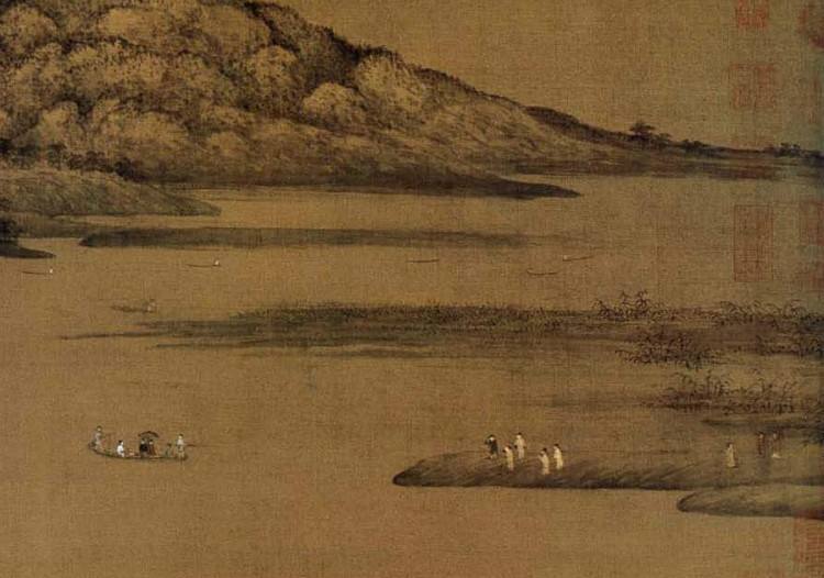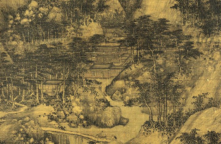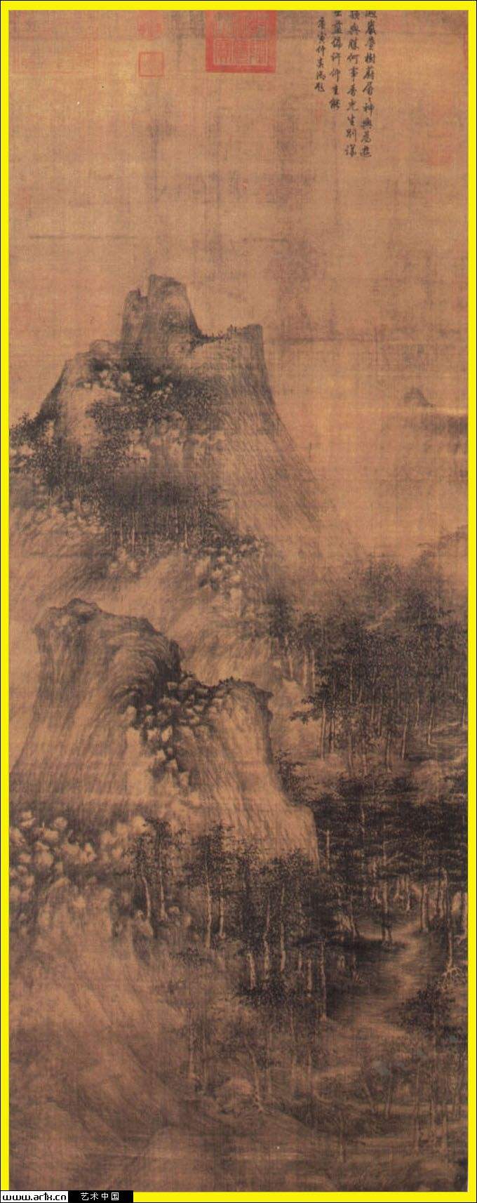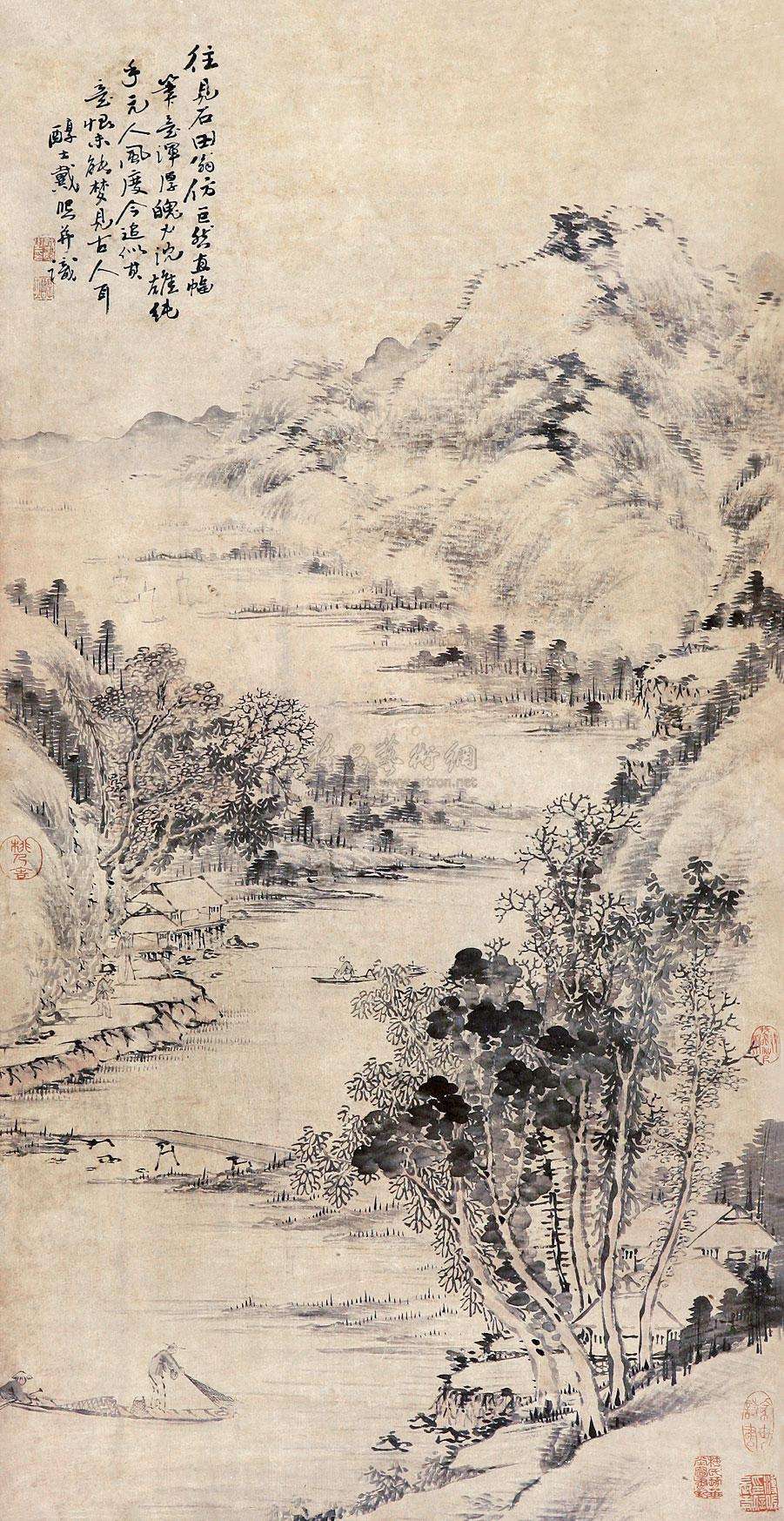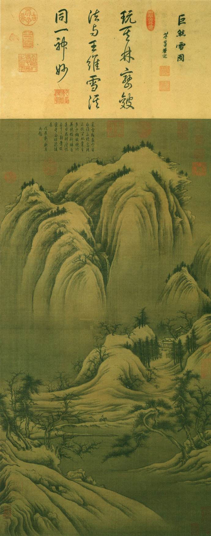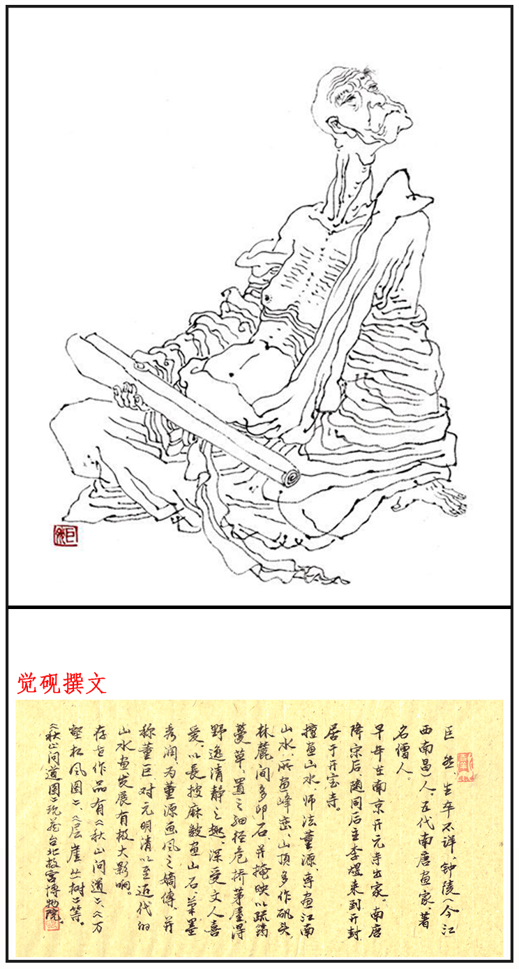 巨然,生卒年不详,钟陵(今江西南昌)人。五代南唐画家,著名僧人。早年在南京开元寺出家。南唐降宋后,随同后主李煜来到开封,居于开宝寺。擅画山水,师法董源,专画江南山水,所画峰峦 ,山顶多作矾头,林麓间多卵石,并掩映以疏筠蔓草,置之细径危桥茅屋,得野逸清静之趣,深受文人喜爱。以长披麻皴画山石,笔墨秀润,为董源画风之嫡传,并称董巨,对元明清以至近代的山水画发展有极大影响。留有《万壑松风图》(宋仿)、《秋山问道图》、《山居图》等传世。