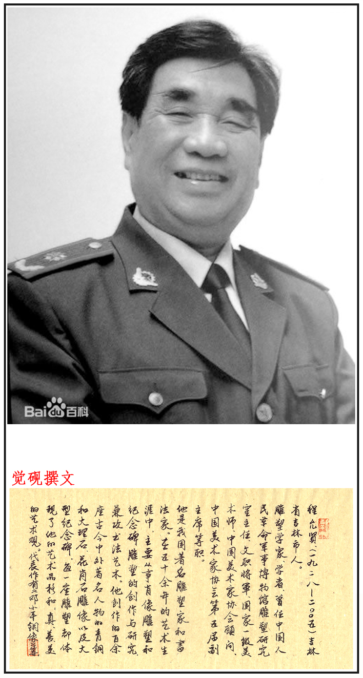 程允贤,,男,吉林省吉林市,1928年9月,雕塑学家、学者、现任中国人民革命军事博物馆雕塑研究室主任、文职将军、国家一级美术师、中国美术家协会顾问、中国美术家协会第五届副主席。程允贤是著名雕塑家和书法家。在五十余年的艺术生涯中,主要从事肖像雕塑和纪念碑雕塑的创作与研究,兼攻书法艺术。他创作的百余座古今中外著名人物的青铜和大理石、花岗石雕像以及大型纪念碑,以深厚的造型功力,生动的形体语言,展示人物的神采风貌,力求刻画其内在的心态、情感、风骨和气质。如:为纪念毛泽东诞辰一百周年的韶山毛泽东巨型雕塑像。意在像中,神在言外,体现了作者的艺术品格和"真、善、美"的艺术观。国内四十多个城市、港、台以及日本、新加坡、泰国、德国、美国、朝鲜、汤加等地均有他的肖像雕塑,纪念碑雕塑或其他雕塑作品。在历届全国性大型美术作品展览中多次获奖或担任评委。有九件作品被国家美术馆收藏。中国人民革命军事博物馆专设《程允贤雕塑艺术馆》,长期陈列。
