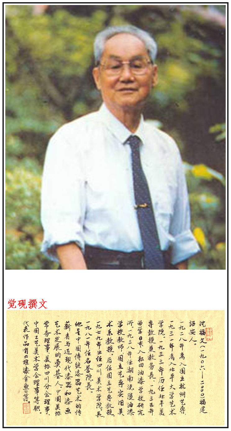 沈福文(1906.2—2000)。福建诏安人。擅漆器工艺。1928年考入国立杭州艺专,1931年考入北平大学艺术学院。1932年与王启民、杨澹生等同学创立平津木刻研究会。1933年历任北平美专教授兼教务长。1935年留日入松田艺术研究所。1938年任湖南沅陵油漆学校教师,国立艺专实用美术系教授。1938年归国任国立艺专教授。1939年同李有行教授等创办四川省立艺专并任该校教授兼任应用艺术科主任,要作品有《晨曦盘》、《松鹤太阳盘》、《金鱼大漆盘》、《长江三峡神女峰下》、《六蝉堆漆绿彩嵌金花瓶》、《堆漆金鱼》等