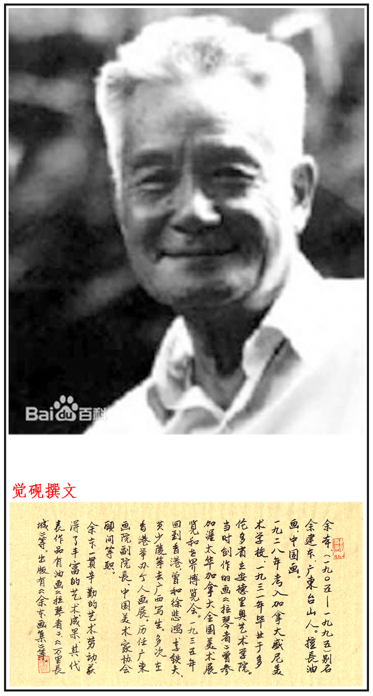 余本(1905.6—1995.1),别名余建本,广东台山人。擅长油画、中国画。1928年考入加拿大盛尼美术学校,1931年毕业于多伦多省立安德里奥艺术学院。1935年回到香港。1956年9月举家回国定居。1957年余本的油画艺术就进入一个新阶段。他力图做一个半路出家的中国画家,通过墨画的尝试去了解民族的绘画传统,以便在油画创作上民族化有所借鉴。余本一贯辛勤的艺术劳动,获得了丰富的艺术成果,代表作品有《拉琴者》、《黄河渡口》、《万里长城》,中国画《江上卧青山》。出版有《余本画集》等。历任广东画院副院长、中国美术家协会顾问。