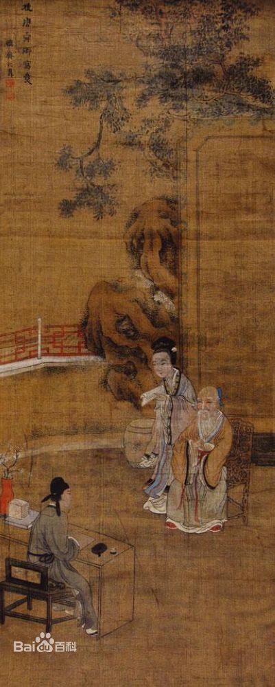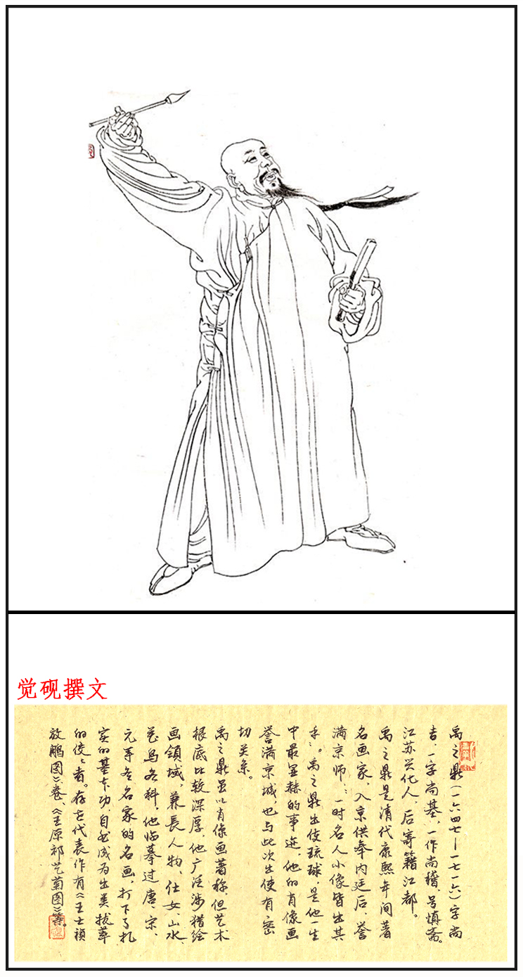 禹之鼎(1647年—1716年),中国清代画家。字尚吉,一字尚基,一作尚稽,号慎斋。后寄籍江都。擅山水、人物、花鸟、走兽,尤精肖像。初师蓝瑛,后取法宋元诸家,转益各师,精于临摹,功底扎实。肖像画名重一时,有白描、设色两种面貌,皆能曲尽其妙。形象逼真,生动传神。有《骑牛南还图》、《放鹇图》、《王原祁艺菊图》等传世。