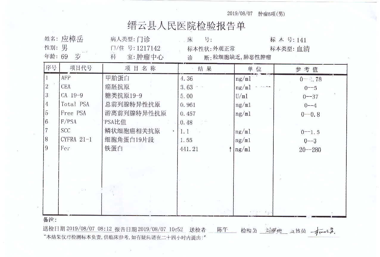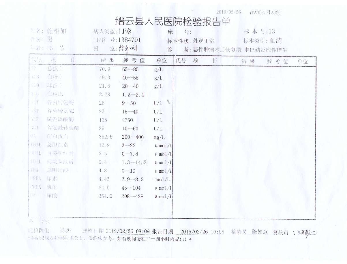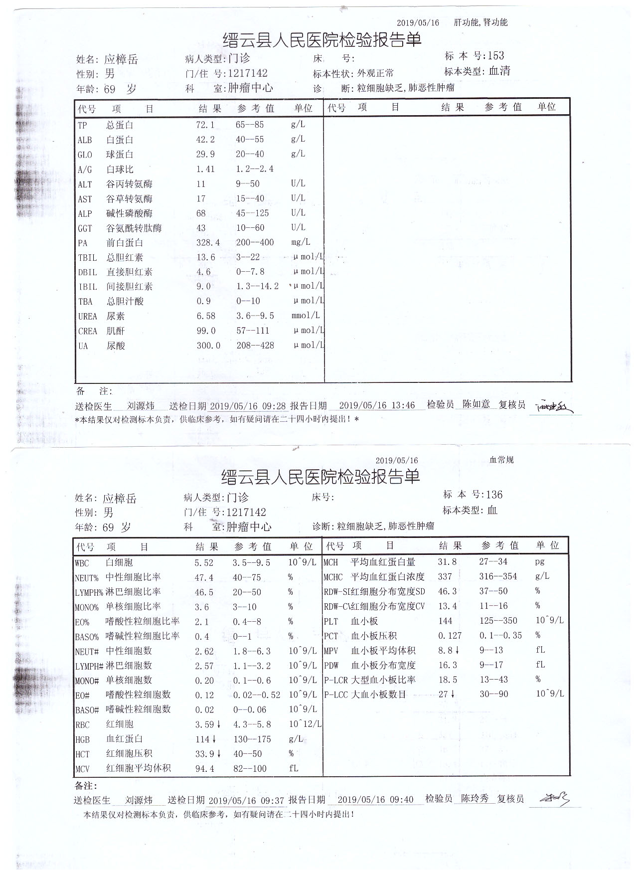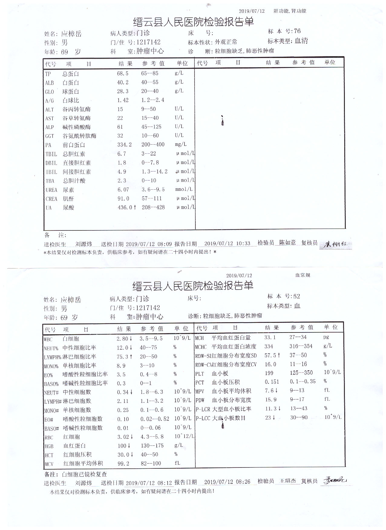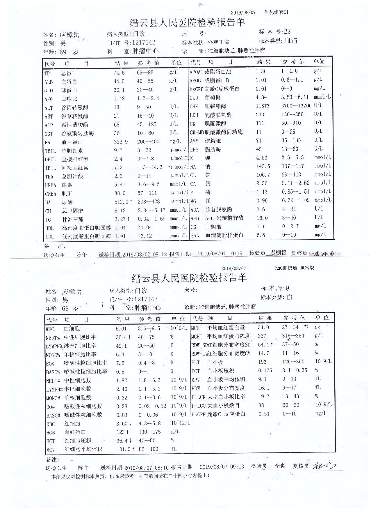 4、原先蛋白严重偏低(2.6),现在已基本正常(在此期间没有使用药物控制),肺部肿瘤未见增大(CT),血生化一切正常,全身舒服、精神状况良好。(下图拍摄于2019年3月30日)