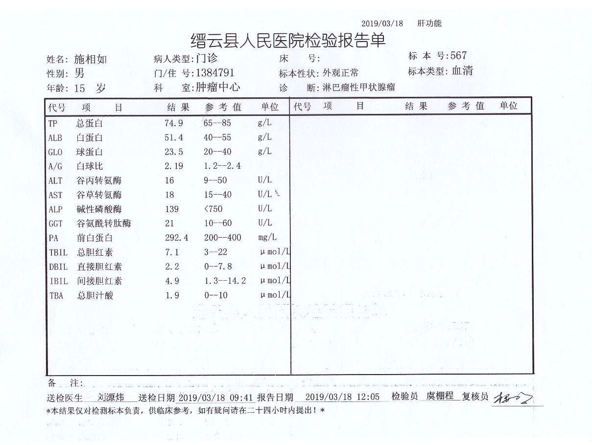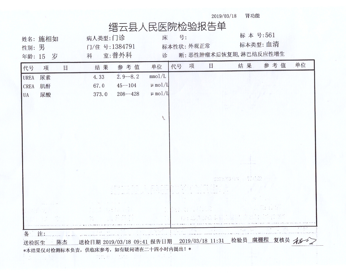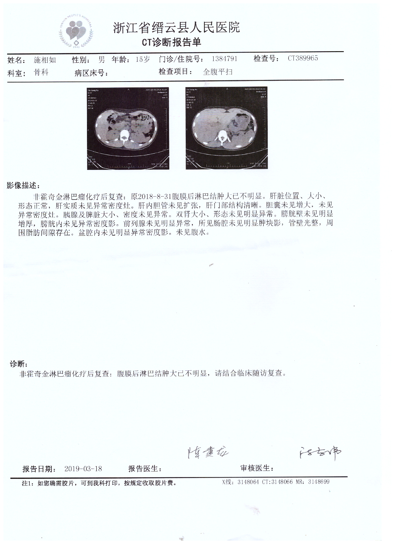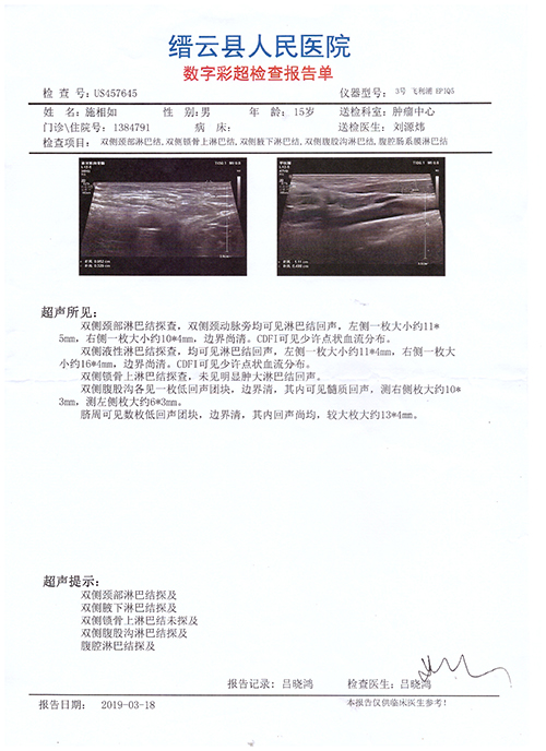 2、吸氢70多天,于2019年3月18日在缙云县人民医院进行全面检查,检测报告显示数据全部正常,吸氢前的37个淋巴瘤基本消失没有了、胃口也特别好、全身充满力气、以前的症状几乎消失,生活质量明显提高,身体状况精神状况都非常好。