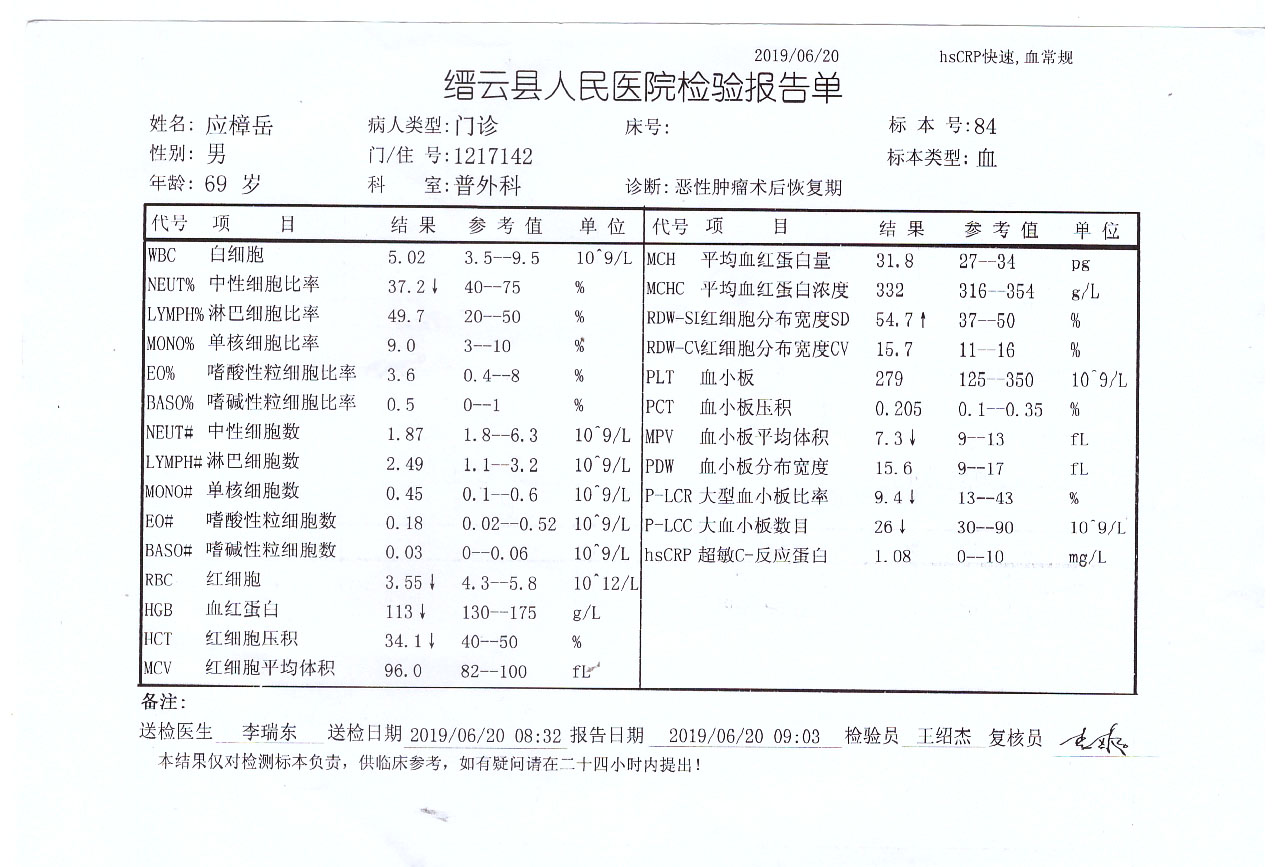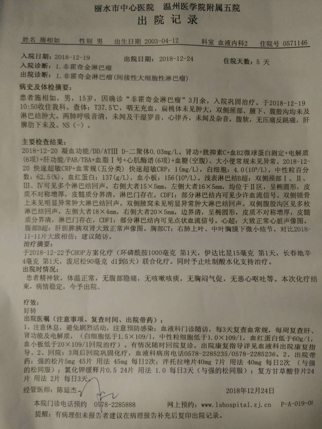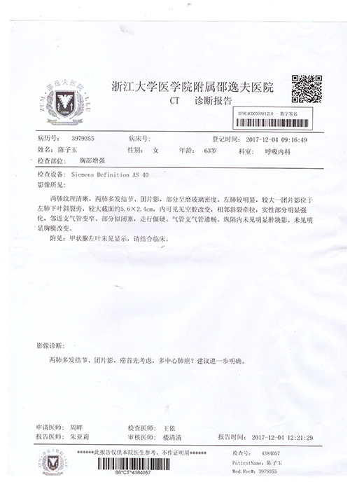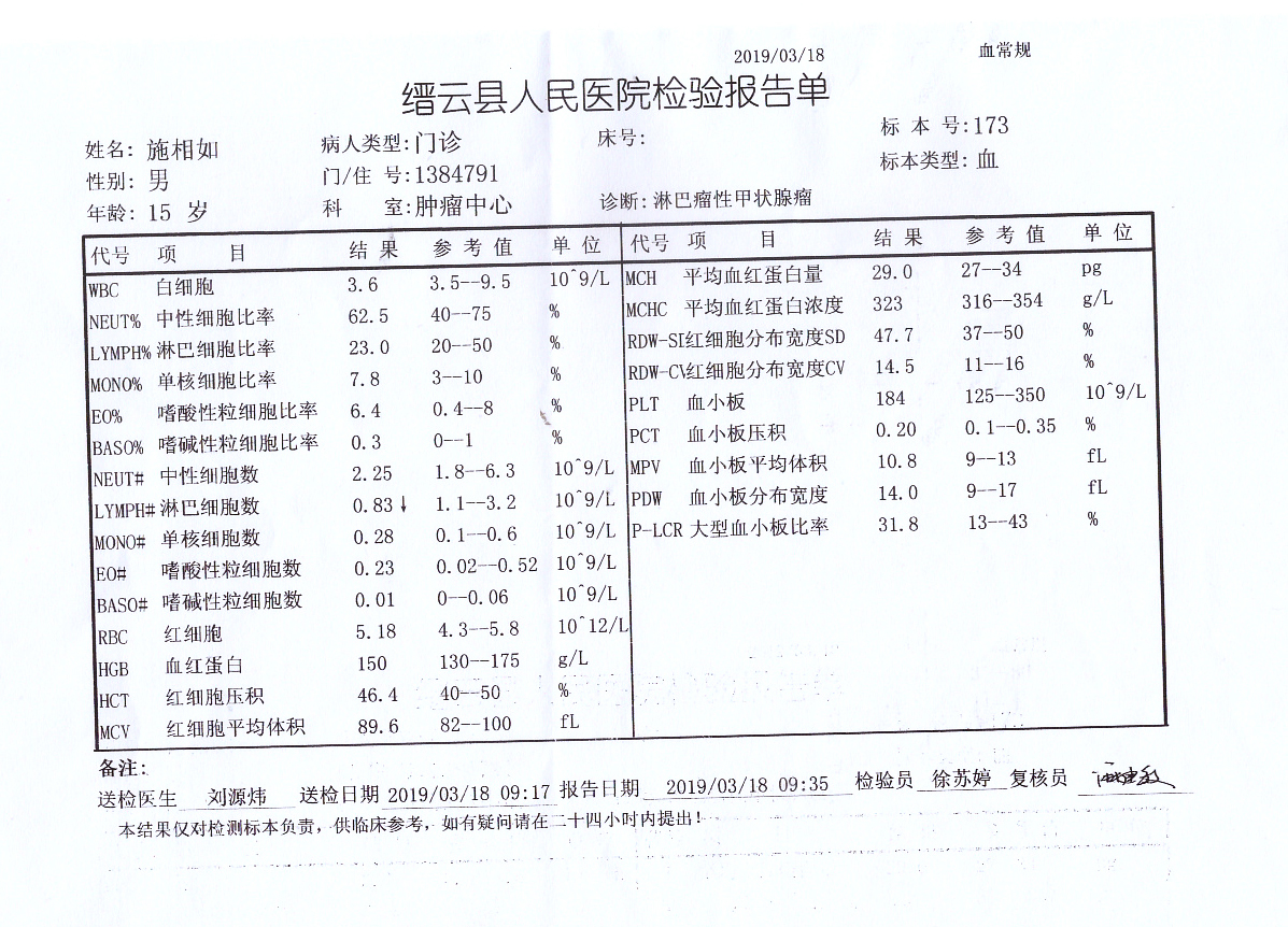 2、吸氢70多天,于2019年3月18日在缙云县人民医院进行全面检查,检测报告显示数据全部正常,吸氢前的37个淋巴瘤基本消失没有了、胃口也特别好、全身充满力气、以前的症状几乎消失,生活质量明显提高,身体状况精神状况都非常好。