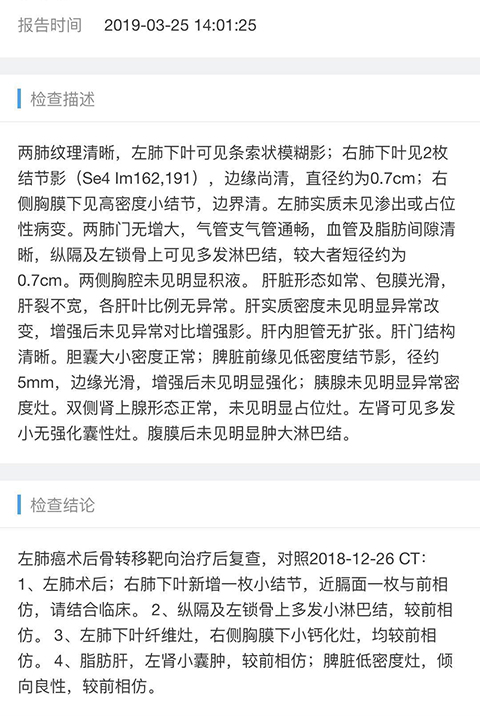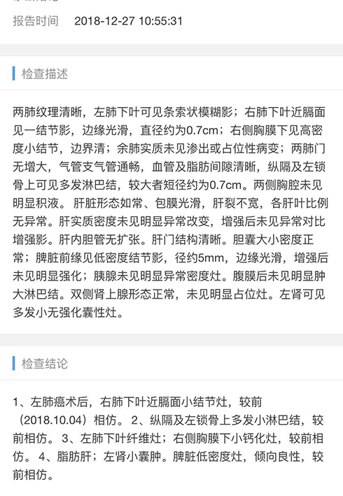 症状:肺癌,扩散至骨髓、左肺切除、右肺下叶0.7新增一枚小结节、左锁骨上多发小淋巴结、左肺下叶纤维灶、右侧胸膜下钙化、脂肪肝、左肾小囊肿。