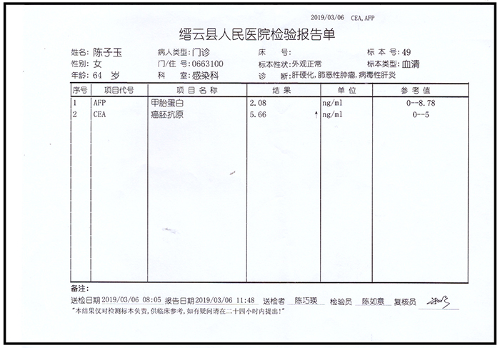 3、吸氢第30天,省人民医院化验结果,癌胚抗原指标下降(CEA为5.66)