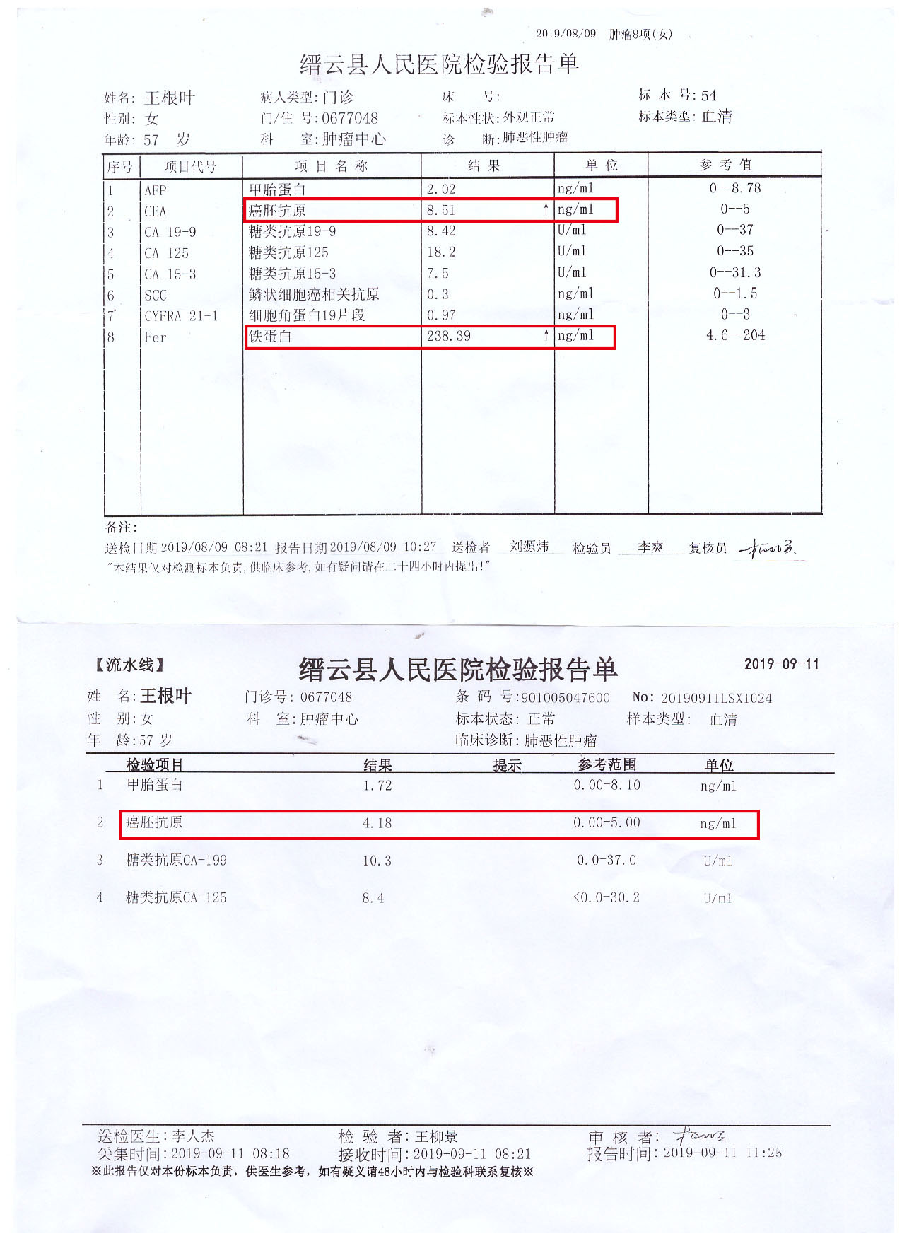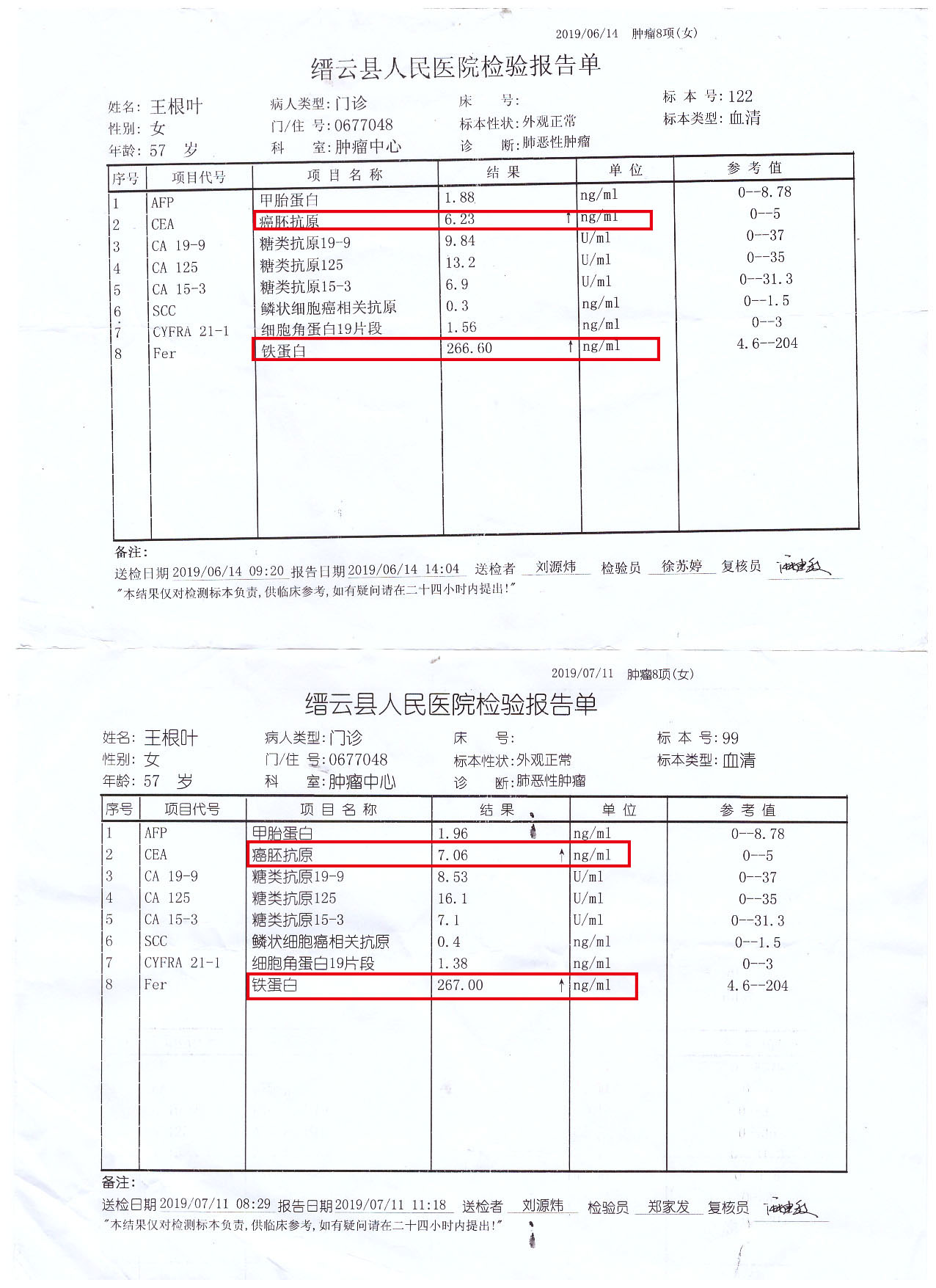 症状:肺癌中晚期,脸色灰暗、声音沙哑、胃口不好、背胀痛、牙痛、身体多处不舒服。化疗12次,癌胚指数高(CEA为7.6)。