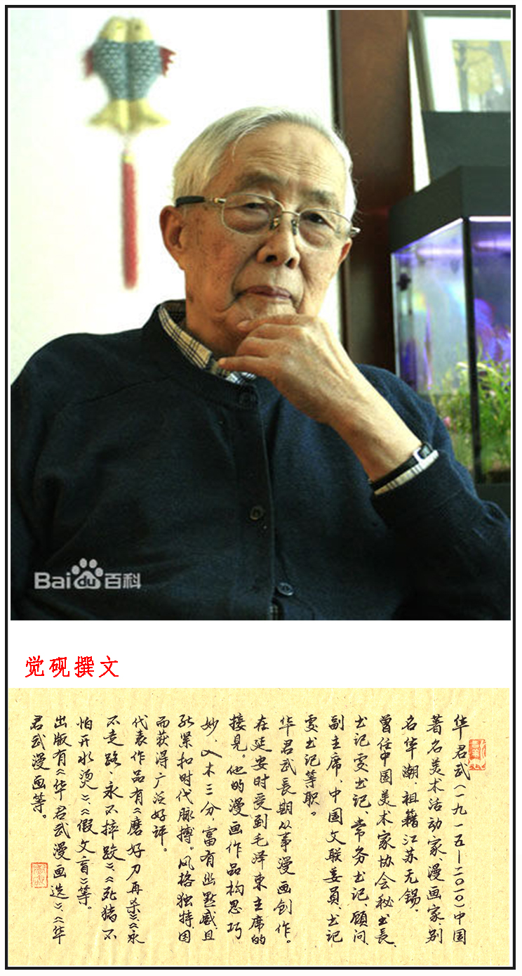 华君武(1915-2010),祖籍江苏无锡荡口,出生杭州;中国著名漫画家;1938年到达延安,华君武从事抗日宣传并为《解放日报》画时事漫画;1940年4月加入中国共产党;1949年12月华君武历任《人民日报》美术组组长、《人民文学》美术顾问;1961年起,华君武开始在《光明日报》的《东风》副刊上发表“人民内部讽刺漫画”;后在“文革”其间受批斗;1979年华君武当选中国美协副主席,曾任全国人大代表、政协委员;2010年6月因病于北京逝世,享年95岁。
