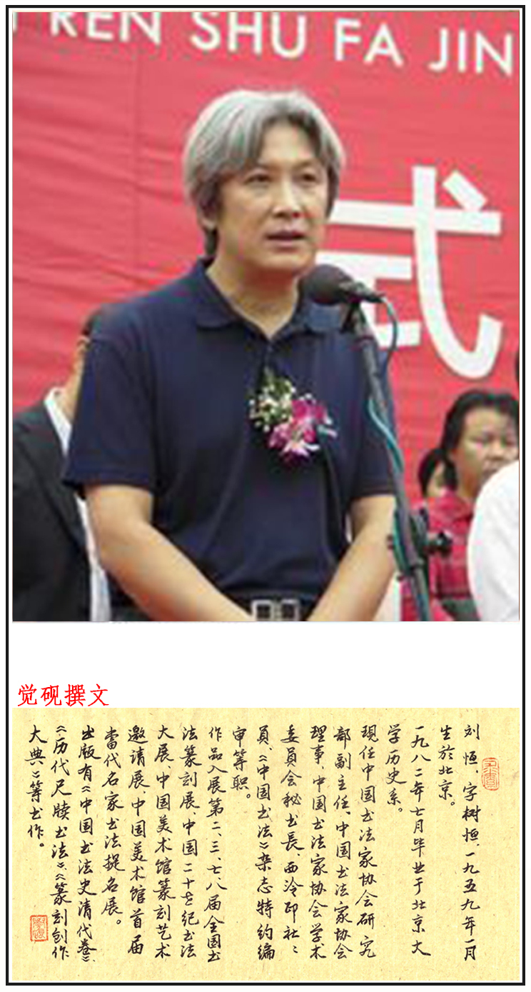 刘恒,字树恒,一九五九年一月生於北京,一九八二年七月毕业於北京大学历史系。先后供职於首都博物馆、《中国书法》杂志社,现任中国书法家协会研究部副主任。为中国书协理事、中国书协学术委员会秘书长、《中国书法》杂志特约编审、西泠印社社员、沧浪书社社员。书法篆刻作品曾获全国第二届中青年书法篆刻展优秀作品奖、全国篆刻评比优秀作品奖,著作《中国书法史·清代卷》获第六届“中国图书奖”。作品先后参加第二、三、七、八、九届全国书法篆刻展览、第一、三届全国篆刻艺术展、中国二十世纪书法大展、中国美术馆首届当代名家书法提名展、中国美术馆篆刻艺术邀请展等重大展览。担任第三至八届全国中青展、首届全国青年书法篆刻展、第一、三、四、五届全国楹联书法展、第三至七届全国书学讨论会、中国书法“兰亭奖”理论奖评审委员。出版著作有《中国书法史·清代卷》(江苏教育出版社)、《历代尺牍书法》(知识出版社)、《中国书法全集·张瑞图卷》、《中国书法全集·倪元璐卷》(荣宝斋出版社)、《篆刻创作大典》(新时代出版社)、《中国美术馆当代名家系列作品集·书法卷·刘恒》(河北教育出版社)等,并有论文多篇发表於专业报刊。 [1]